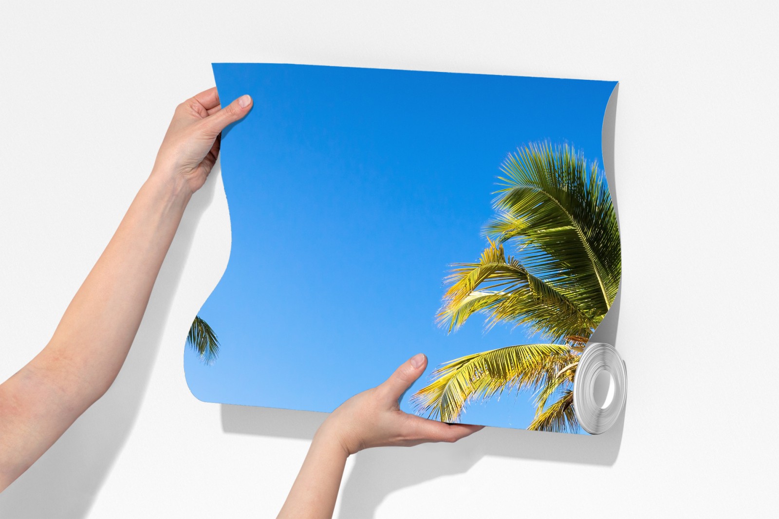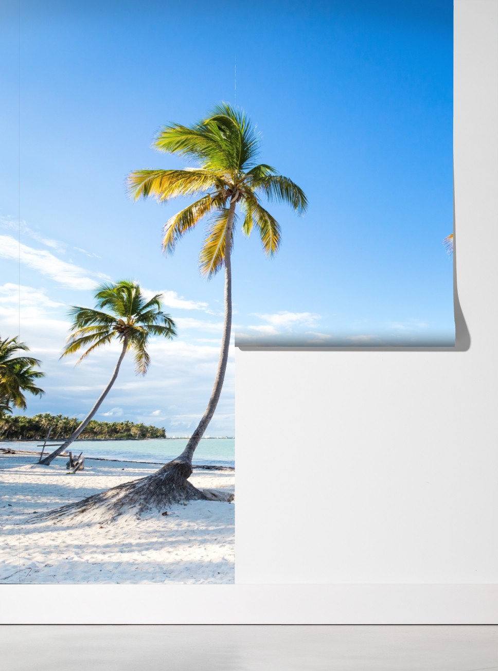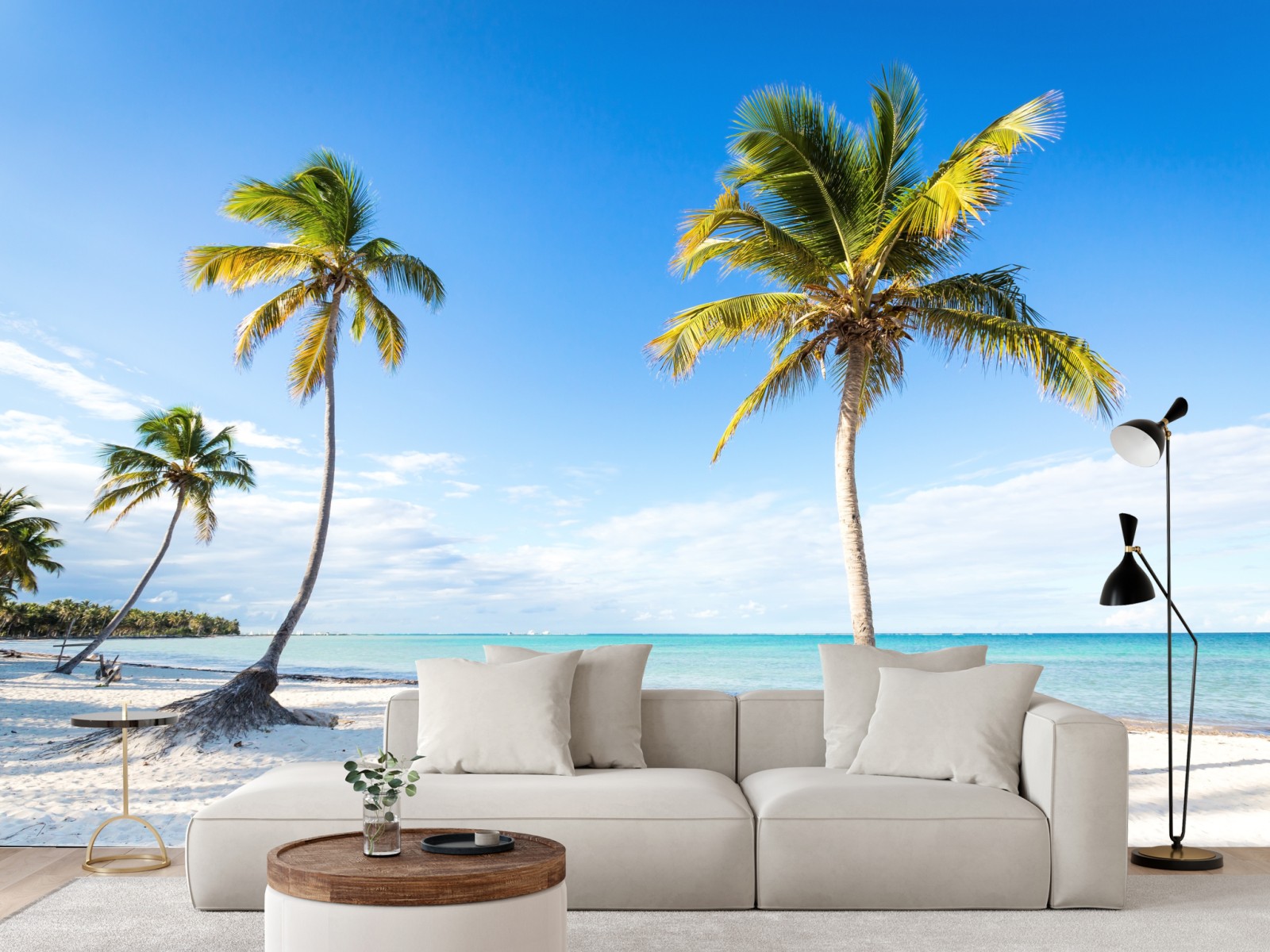 Bringen Sie eine entspannte tropische Stimmung in Ihr Zuhause mit einem sonnenbeschienenen Palmenstrand und türkisblauem Meer, perfekt zum Entspannen.
