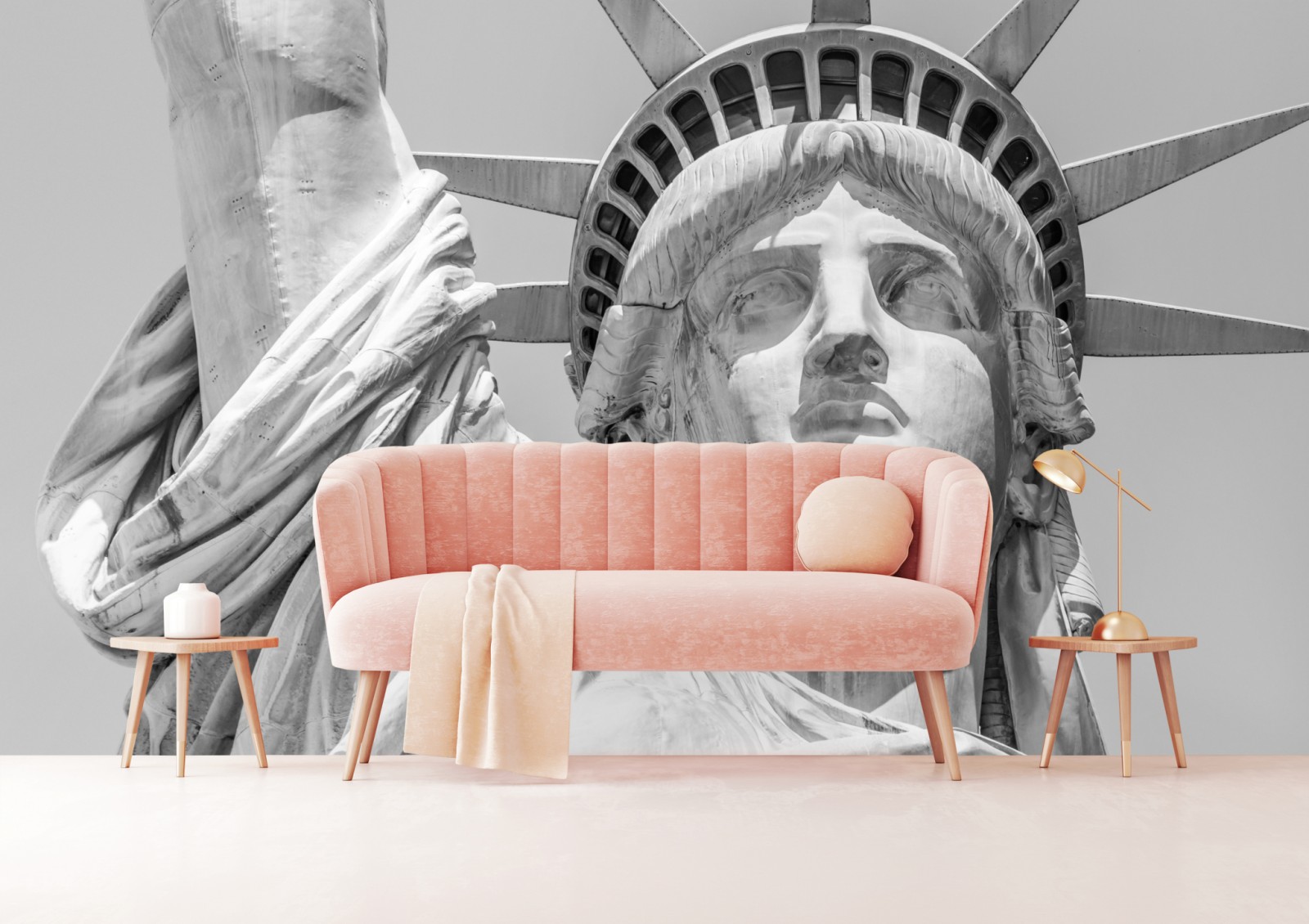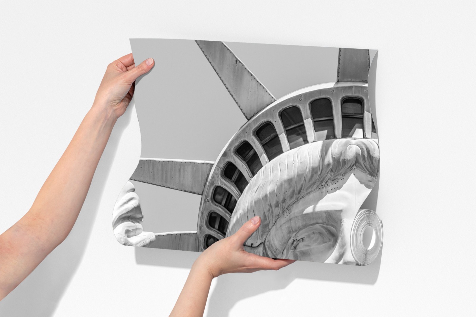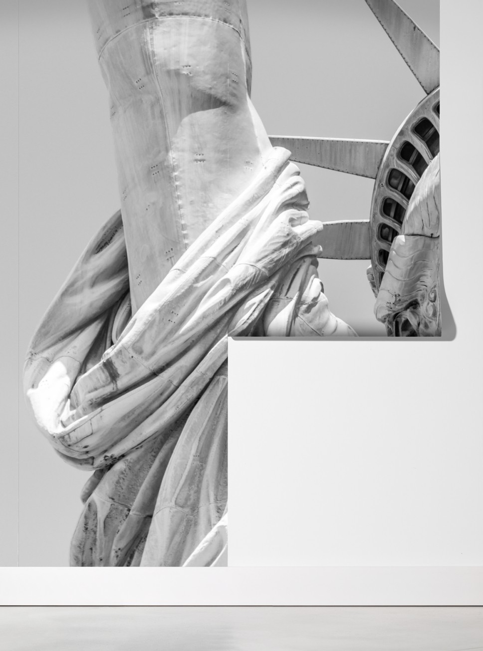 Markante Schwarzweiß-Nahaufnahme der Freiheitsstatue, die architektonische Details und zeitlose Symbolik in moderne Innenräume bringt.