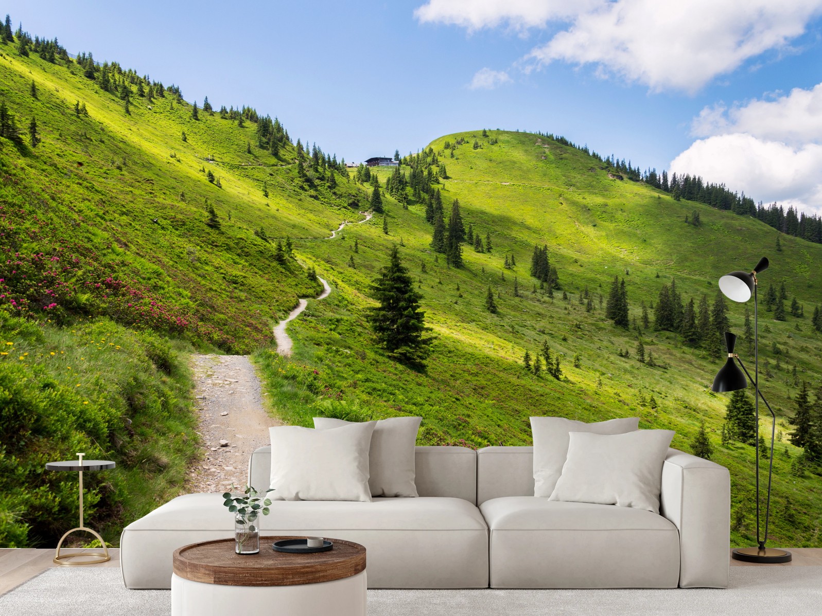 Bringen Sie die Ruhe sonniger Bergwege in Ihr Zuhause mit diesem lebendigen Landschaftsbild.MehrWeniger