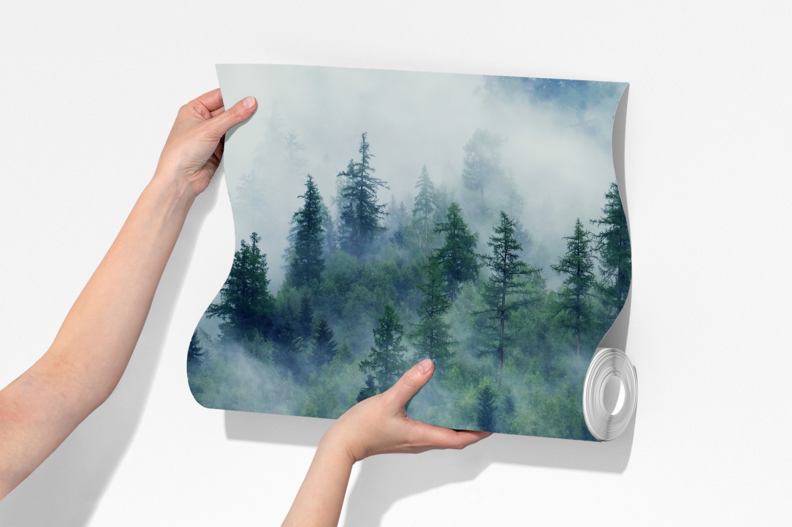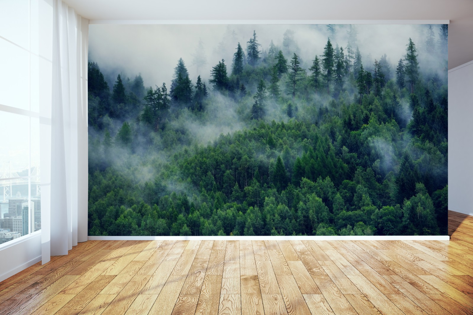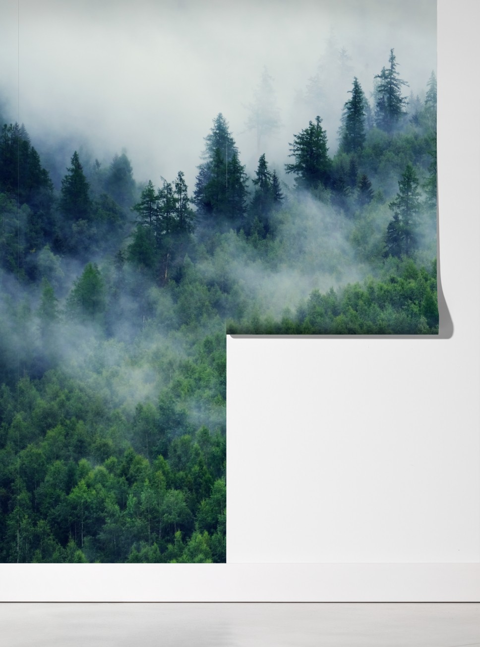 Bringen Sie beruhigende Waldatmosphäre in Ihr Zuhause mit dieser nebligen grünen Landschaft, die dichte Nadelbäume und sanften Nebel einfängt.