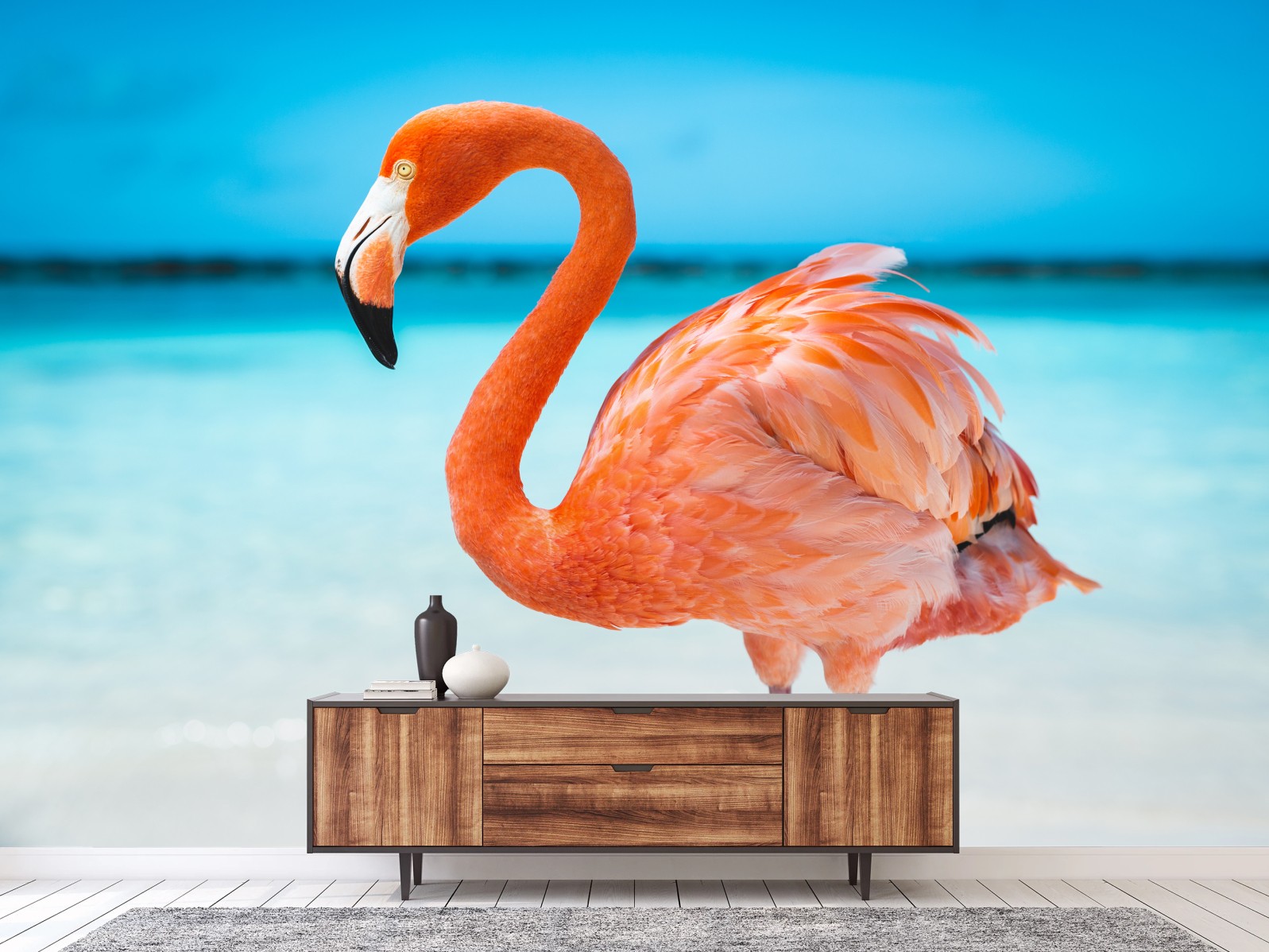 Fototapete Leuchtender rosa flamingo am türkisfarbenen strand