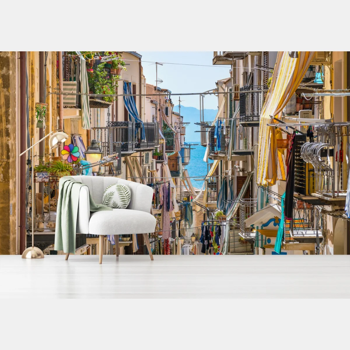 Fototapete Sonnige gasse mit meerblick und balkonen