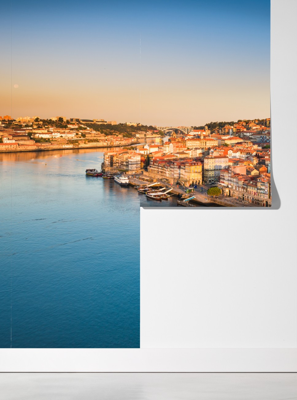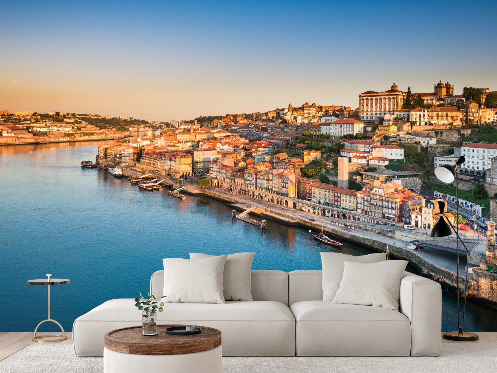 Bringen Sie die goldene Flussufer-Skyline von Porto in Ihr Zuhause mit diesem lebendigen Panorama, ideal für moderne Räume und Reisefans.
