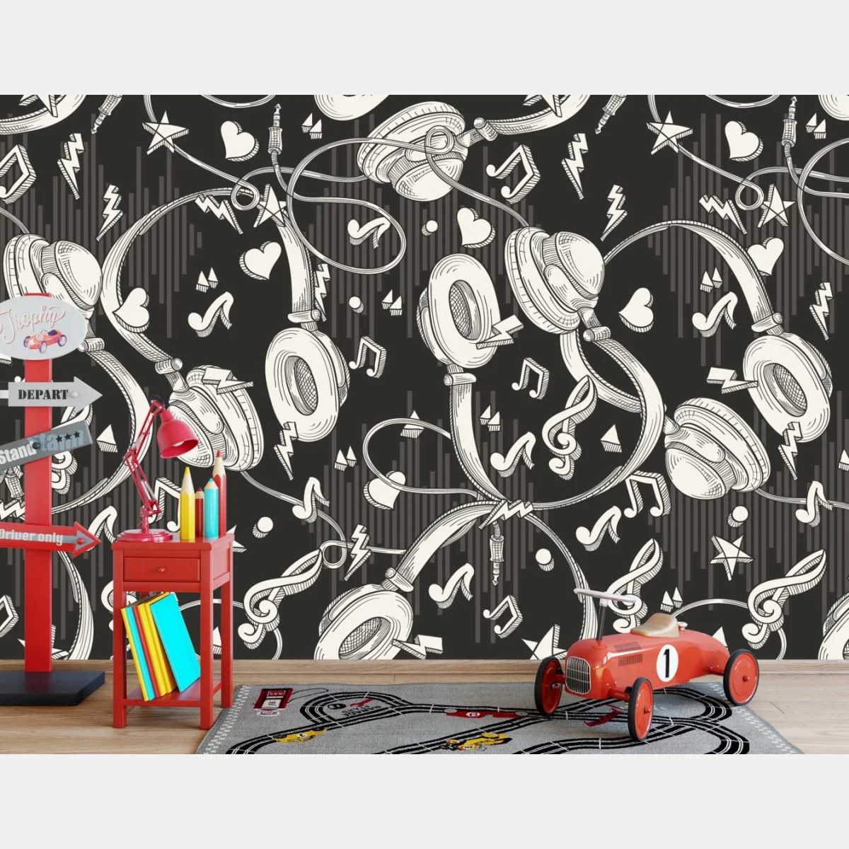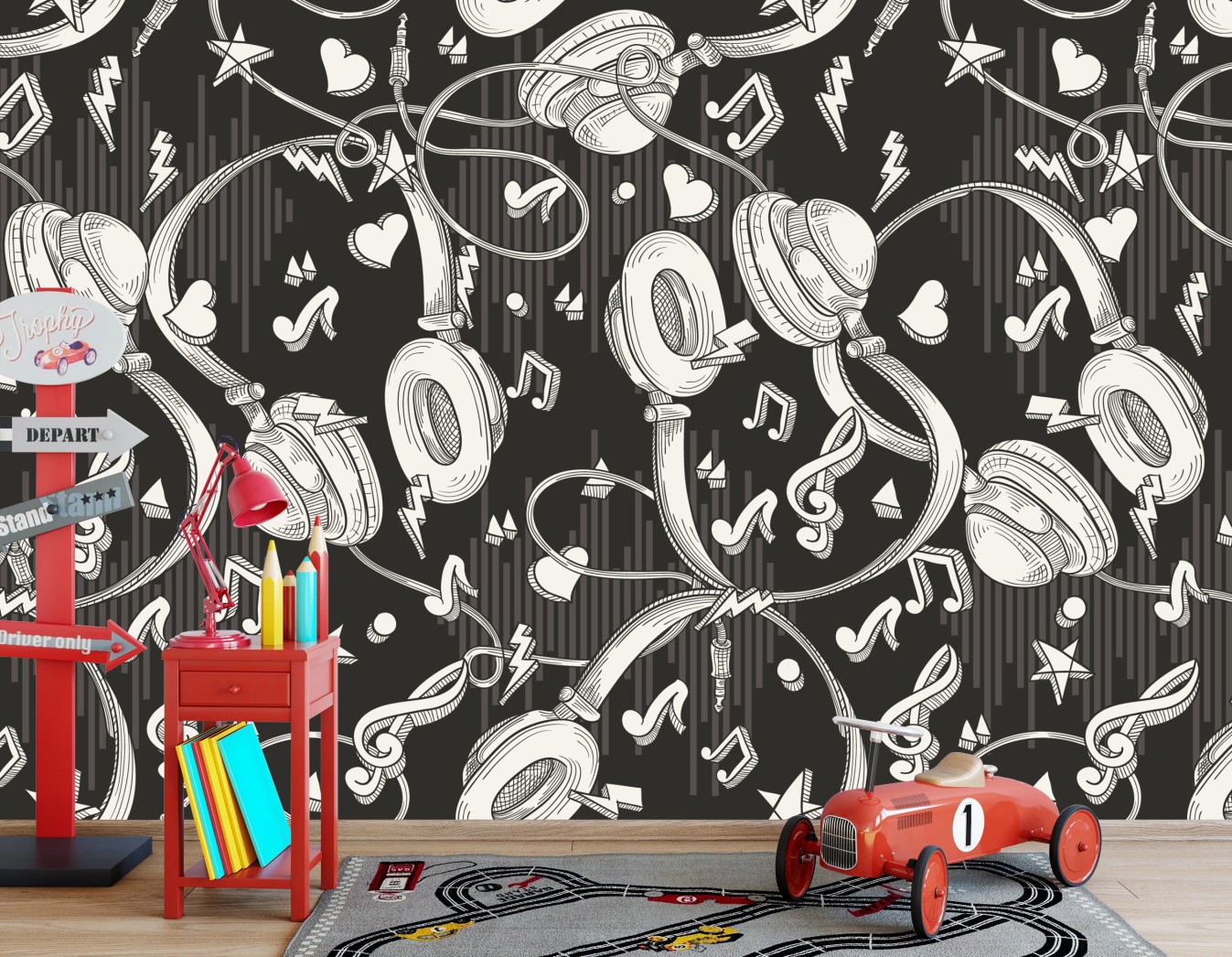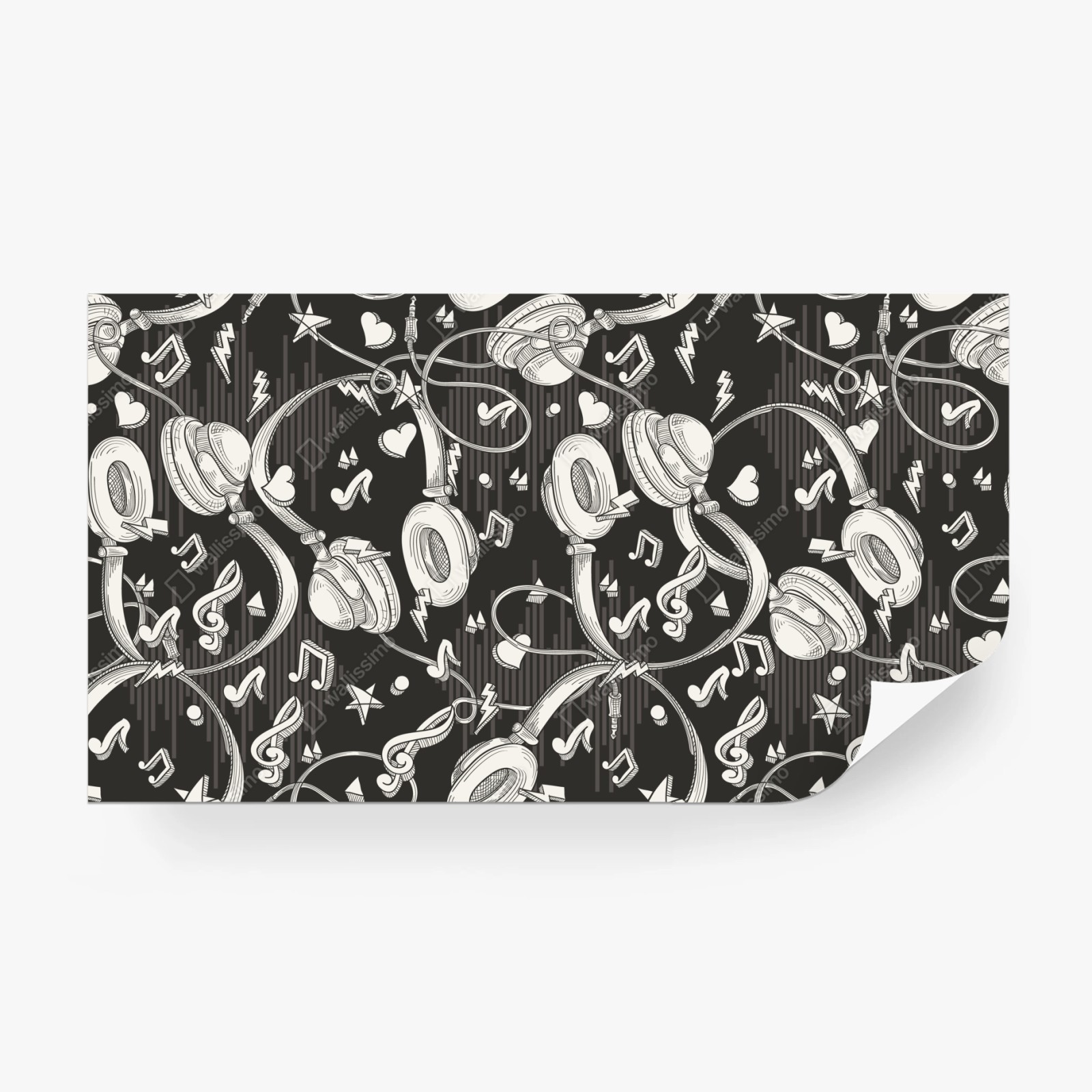Fototapete Monochromatisches muster mit kopfhörern und noten