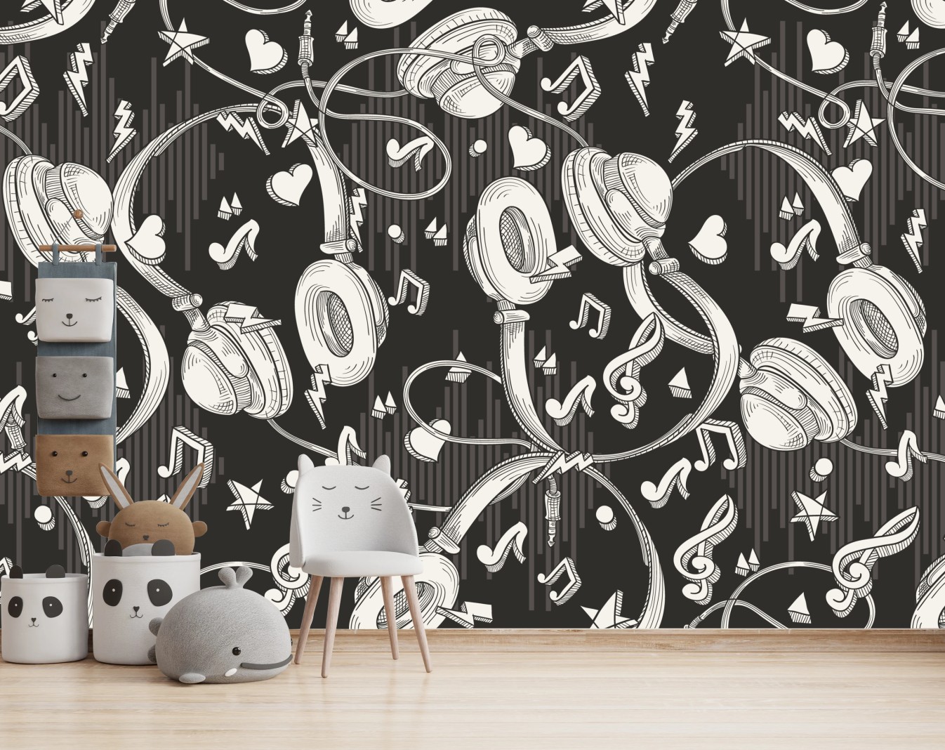 Fototapete Monochromatisches muster mit kopfhörern und noten