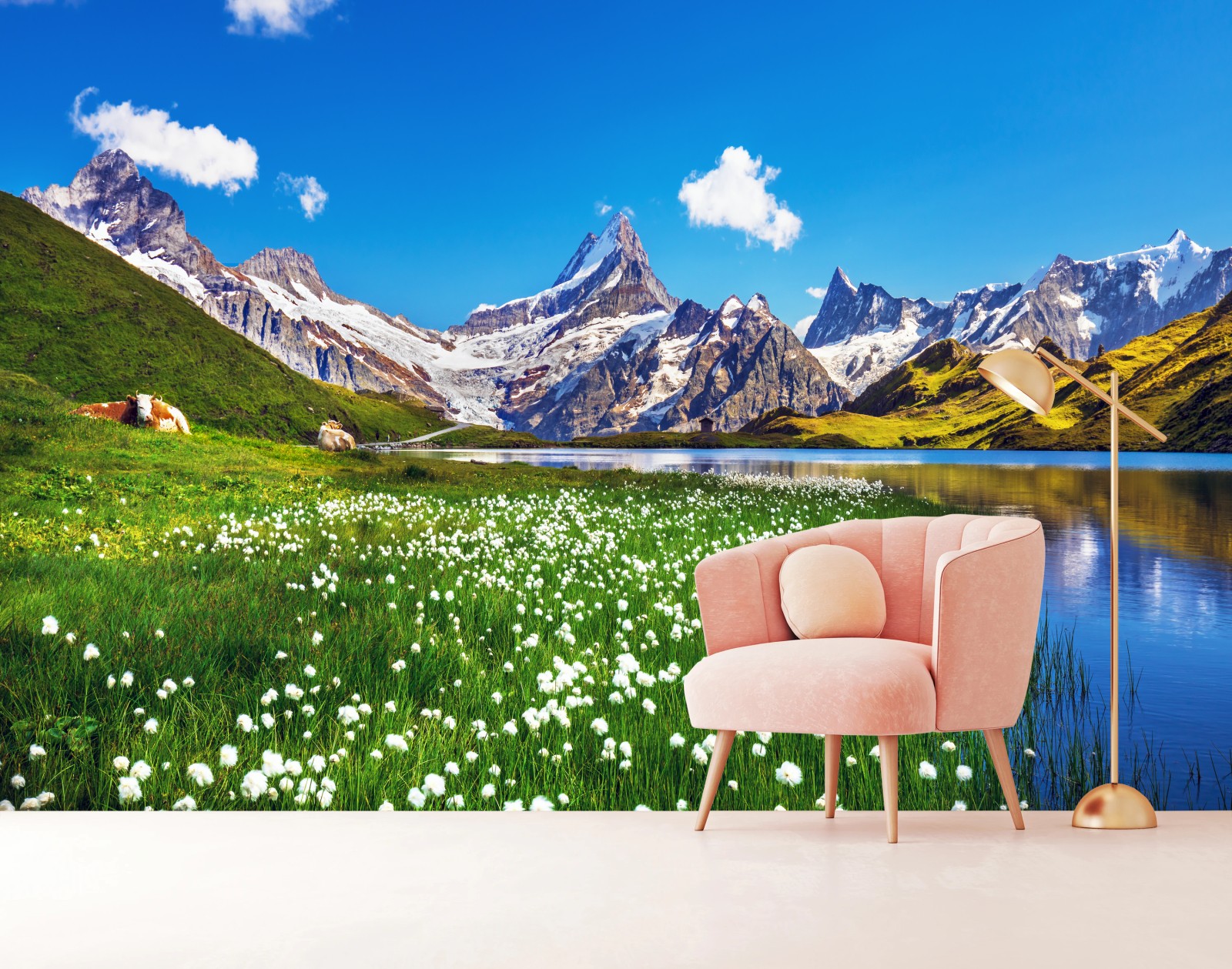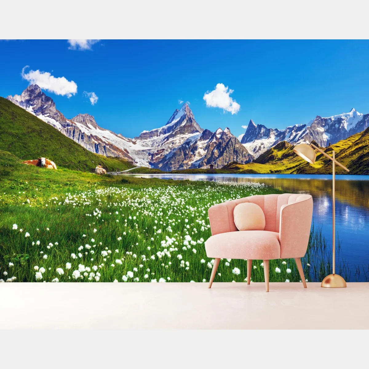 Fototapete Alpensee mit blumenwiese und berggipfeln