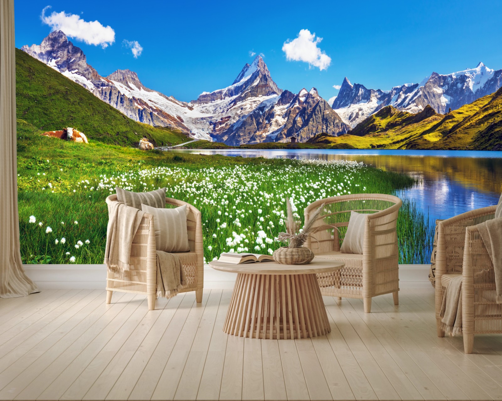 atemberaubende alpenlandschaft mit klarem see, steilen gipfeln und einer wiese voller weißer blumen — ideal, um natürliche ruhe in den raum zu bringen.MehrWeniger