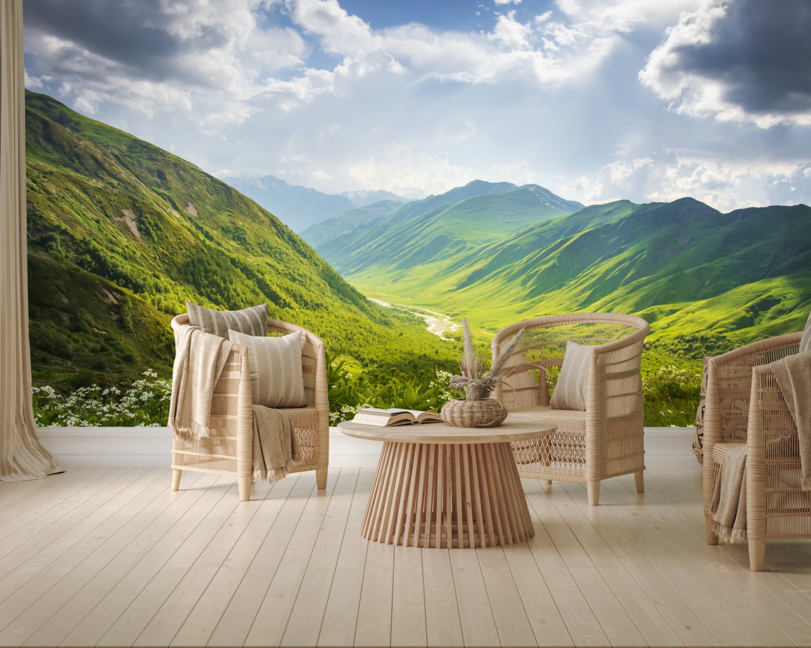 Bringen Sie die ruhige Schönheit der Bergwiesen in Ihr Zuhause mit lebendigen grünen Hügeln und dramatischem Himmel.MehrWeniger