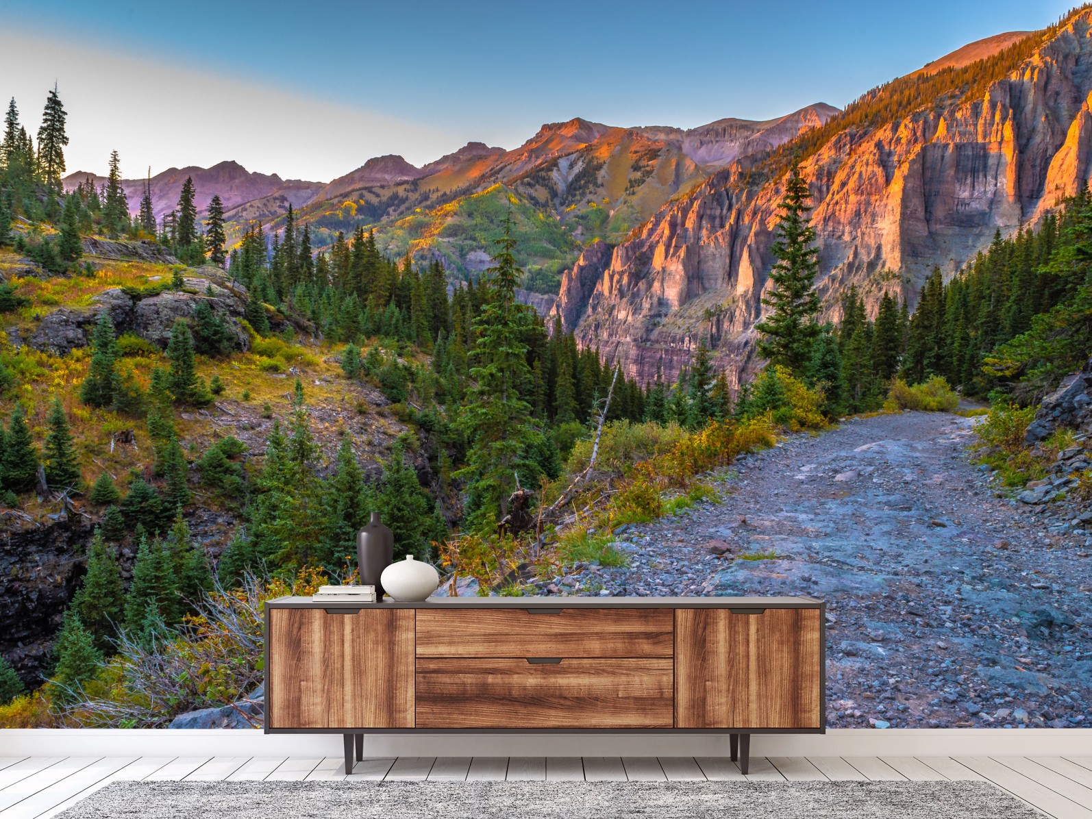 Fototapete Alpiner wanderweg im sonnenuntergang