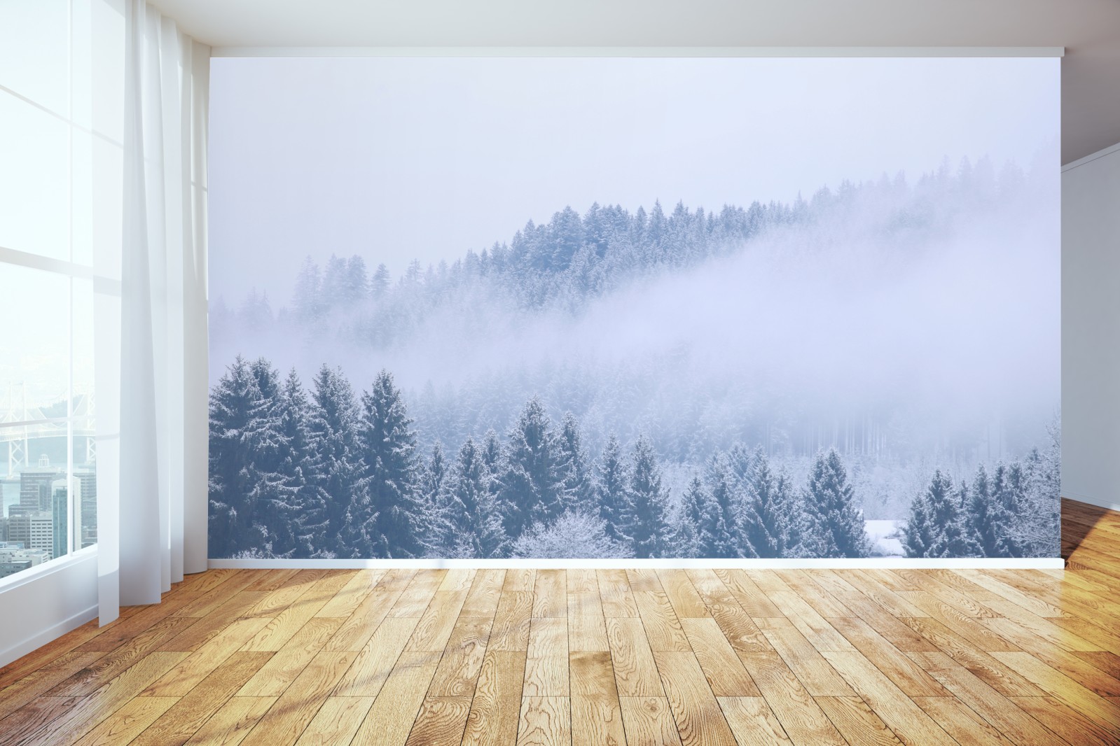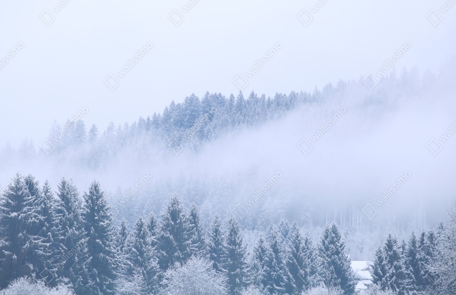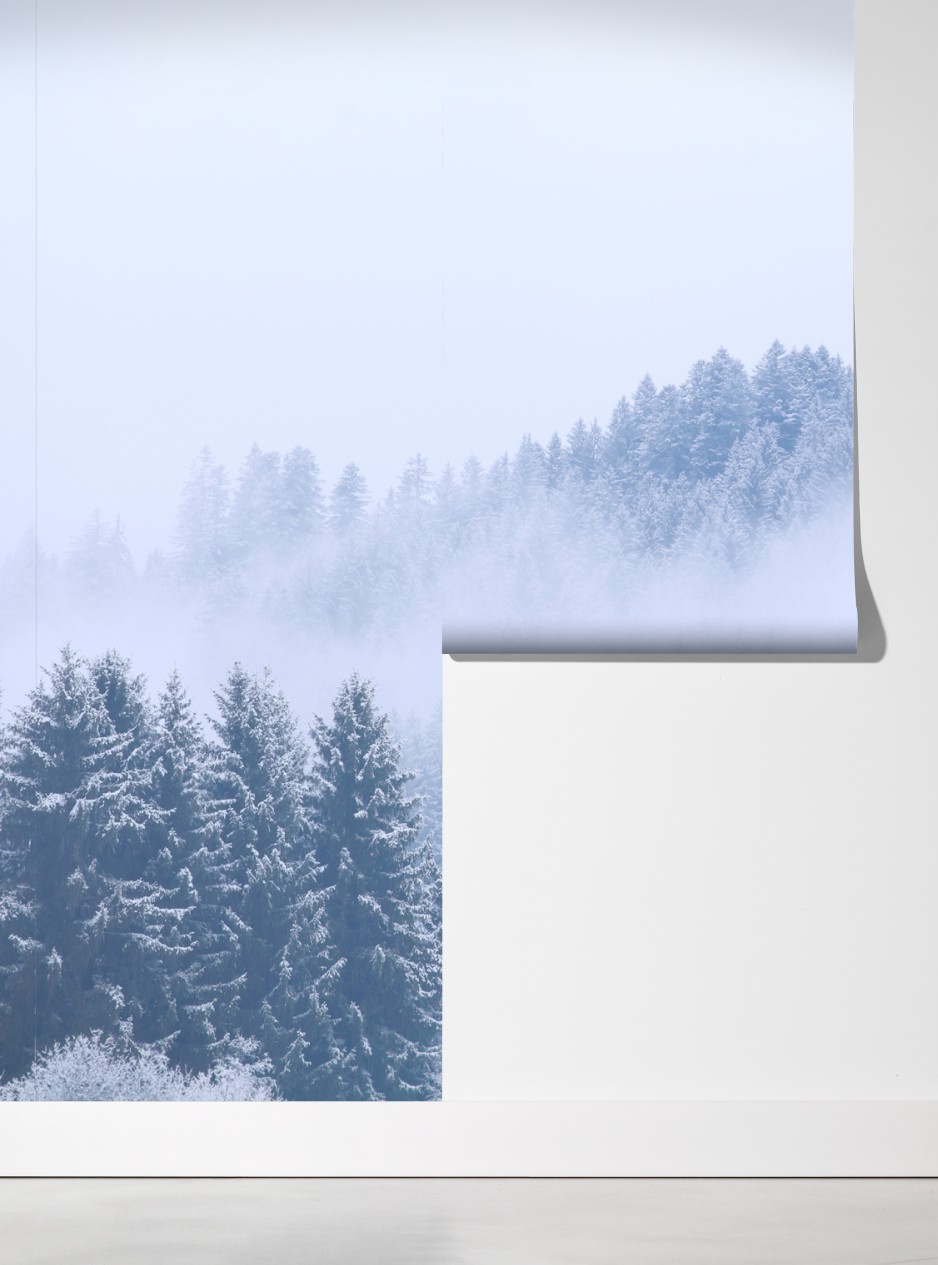 Bringen Sie eine ruhige Winterstimmung in Ihr Zuhause mit diesem schneebedeckten Nadelwald im Nebel, perfekt für moderne Einrichtungen.