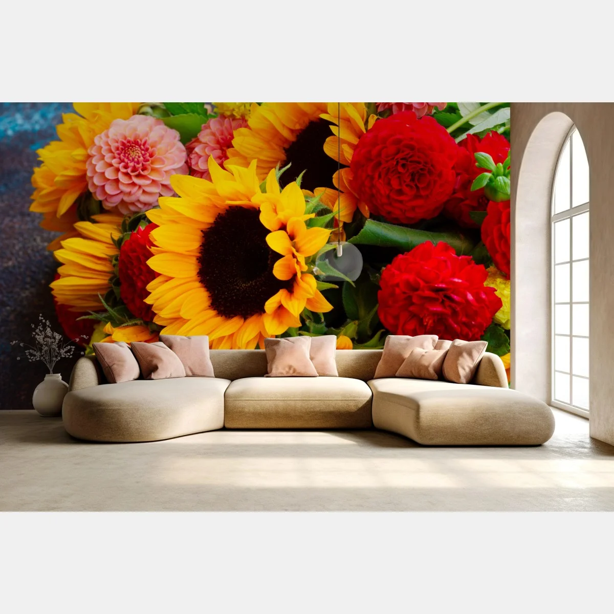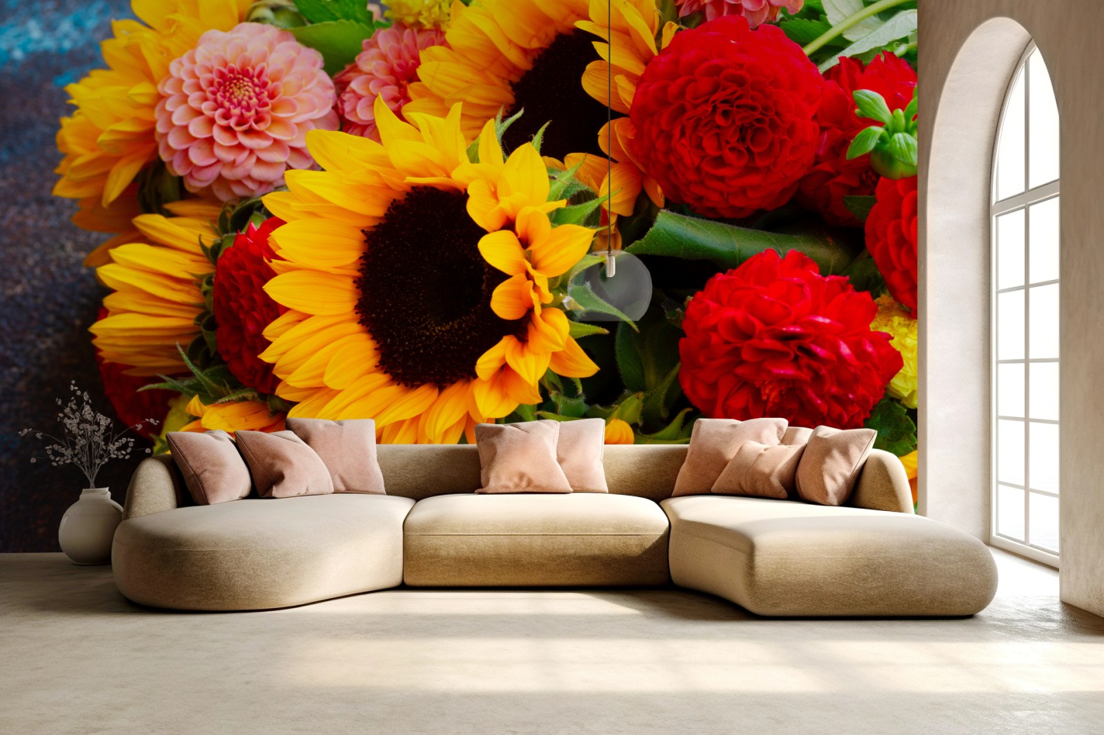 Fototapete Nahaufnahme sonnenblumen- und dahlienstrauß