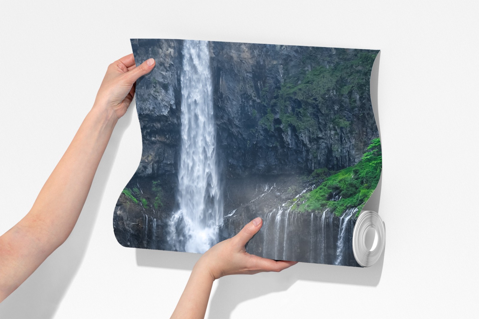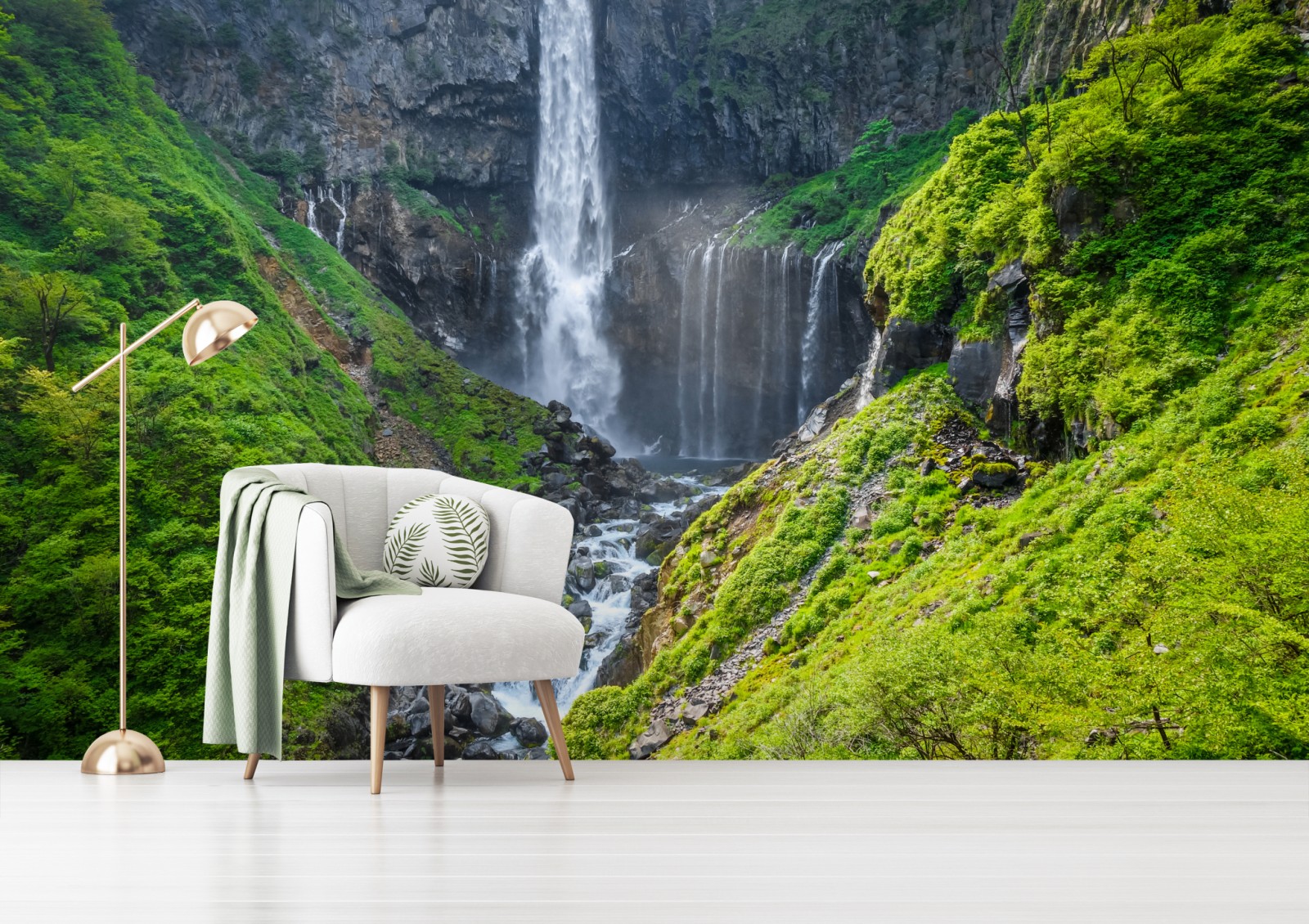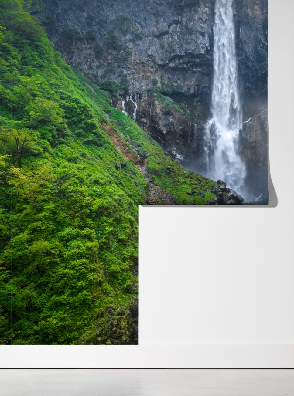 Bringen Sie natürliche Ruhe in Ihren Raum mit einem lebendigen Blick auf den Kegon-Wasserfall in Nikko, Japan, wo üppiges Grün und stürzendes Wasser eine beruhigende Szenerie schaffen.