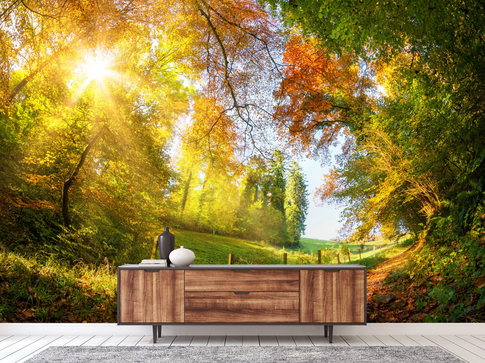 Bringen Sie die Wärme des goldenen Herbstes in Ihr Zuhause mit diesem lebendigen Landschaftsbild, das sonnenbeschienene Wiesen und einen gewundenen Waldweg zeigt.MehrWeniger