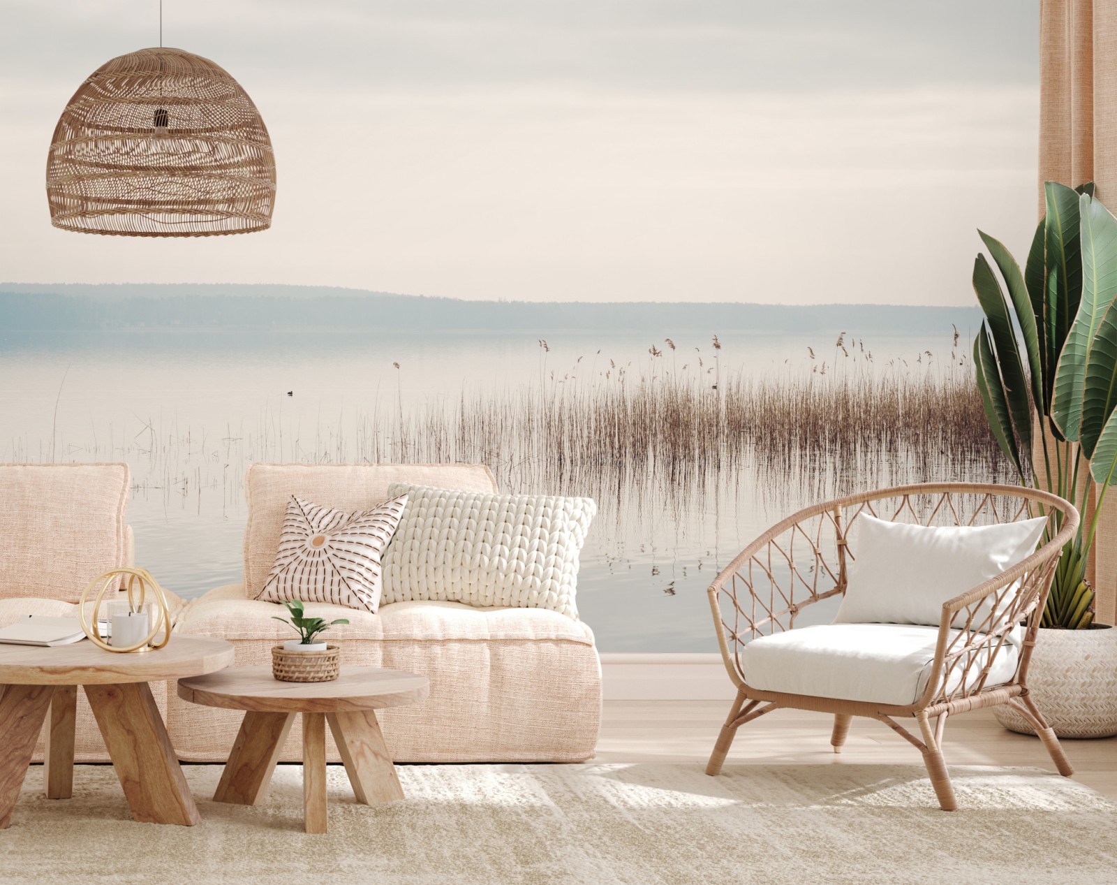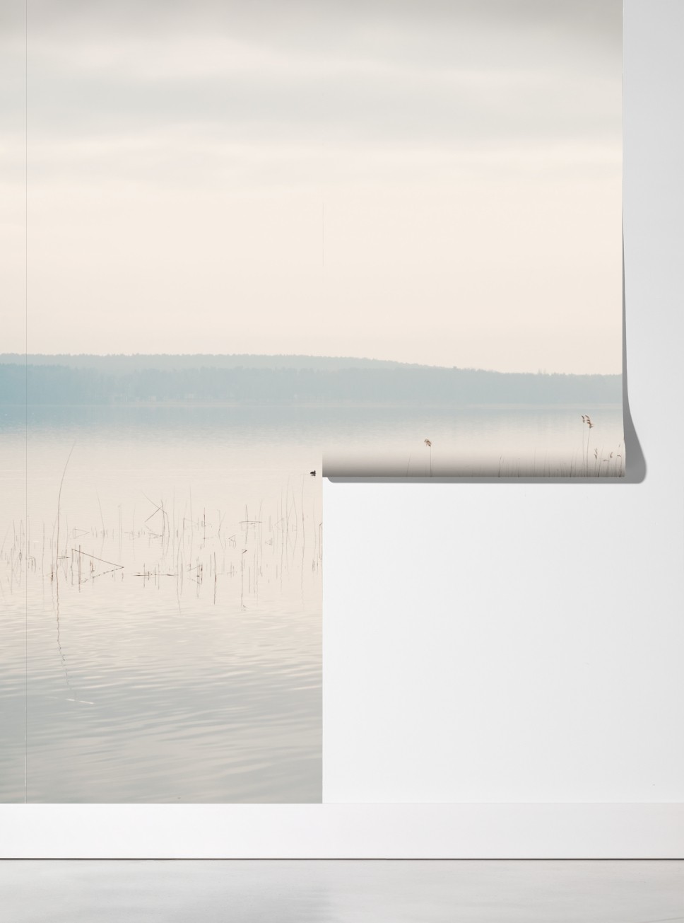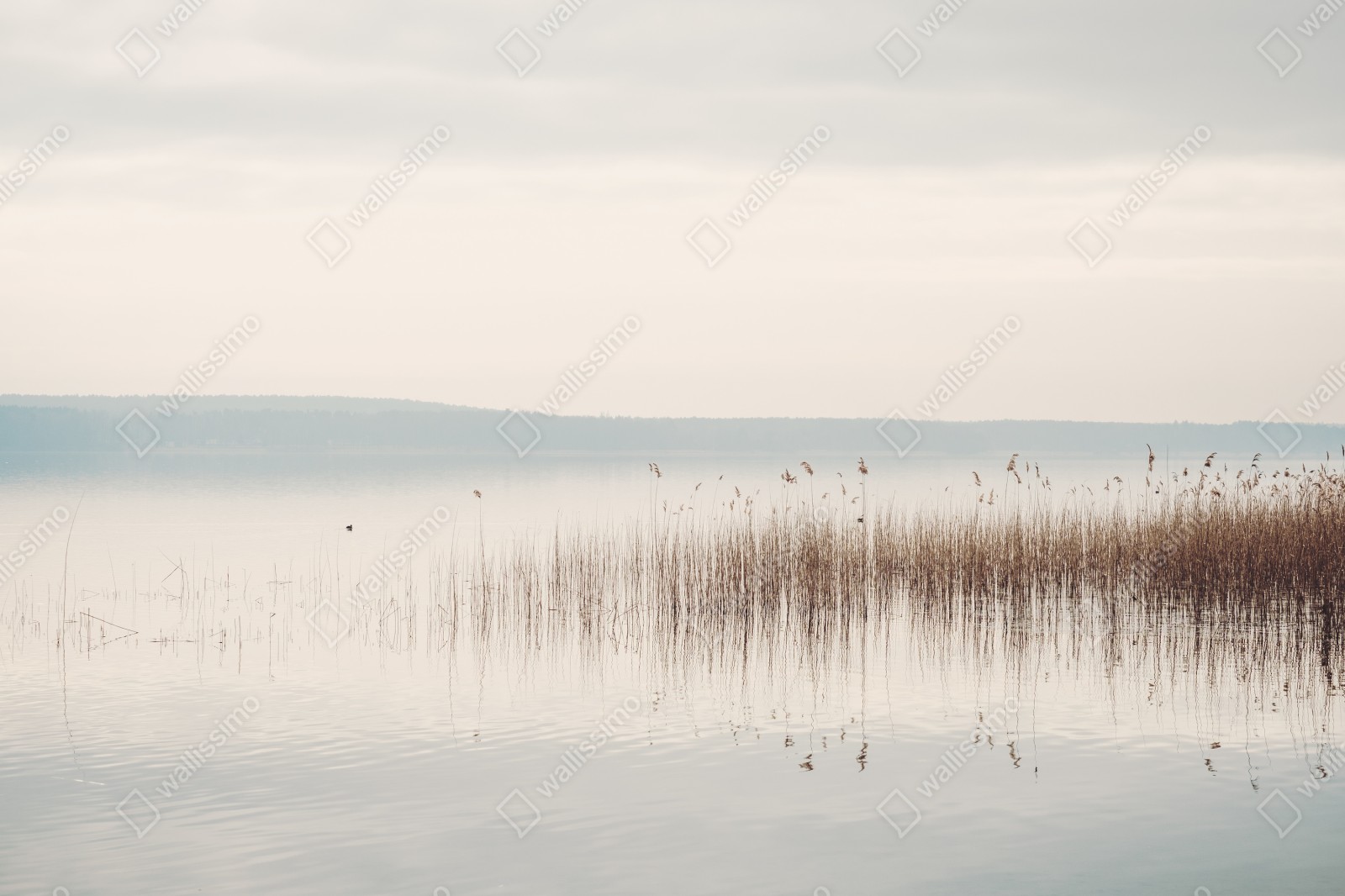 Bringen Sie ruhige und minimalistische Atmosphäre in Ihr Zuhause mit diesem pastellfarbenen Seeufermotiv mit filigranem Schilf und sanften Spiegelungen.