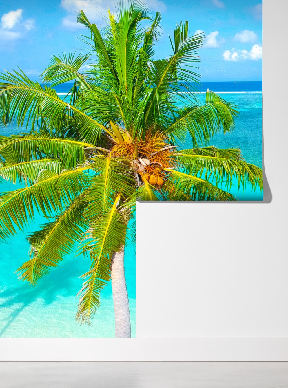 Bringen Sie ein Stück tropisches Paradies in Ihr Zuhause mit dieser lebhaften Luftaufnahme einer Palme und des türkisfarbenen Ozeans.