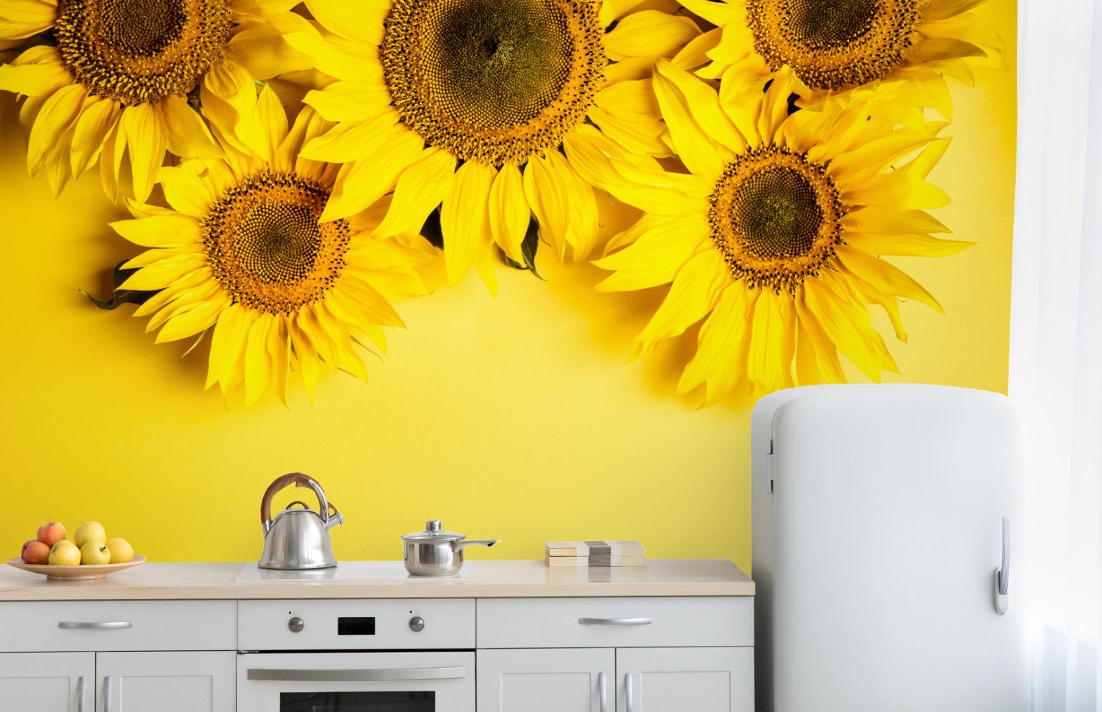 Fototapete Leuchtender sonnenblumenstrauß auf gelbem hintergrund
