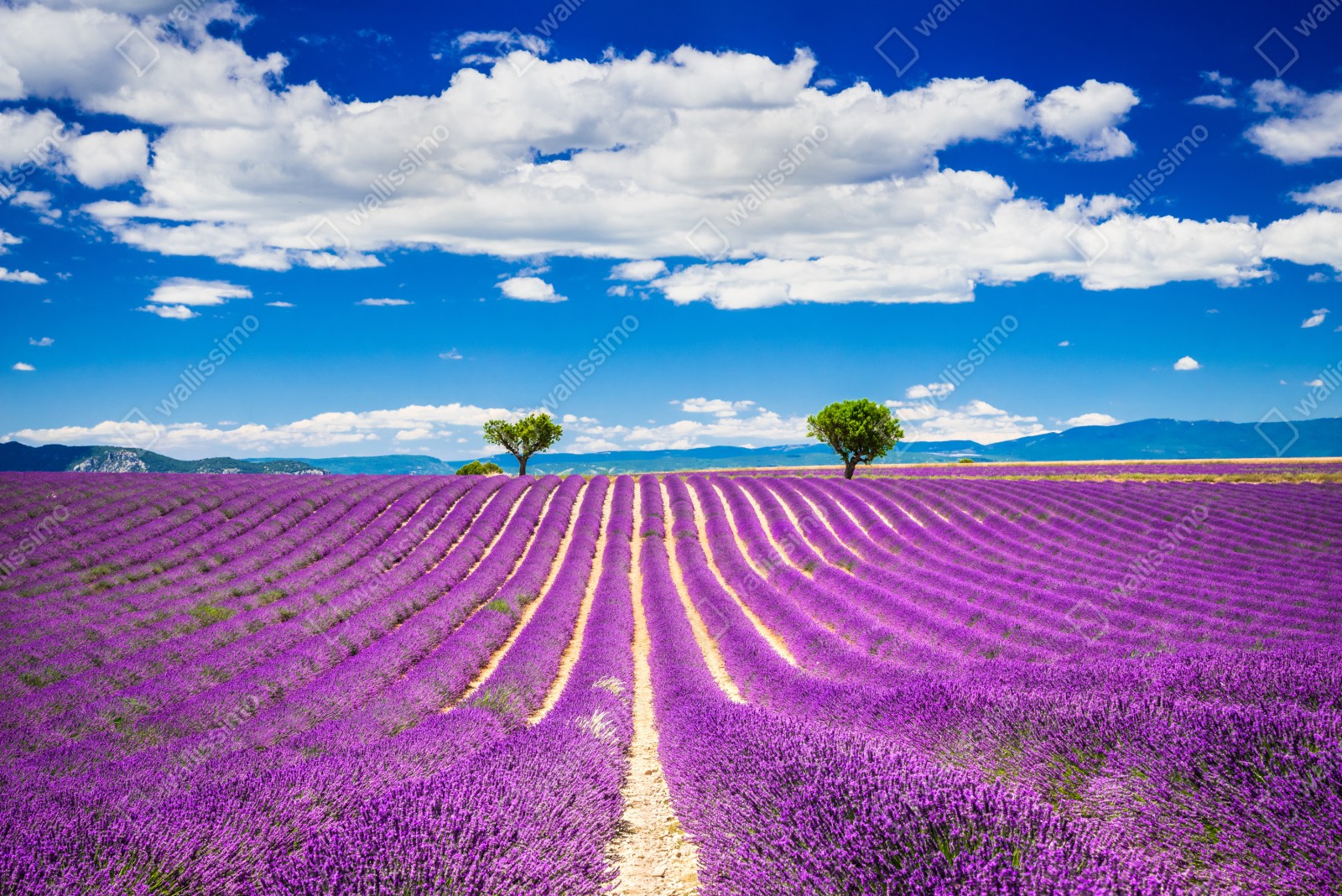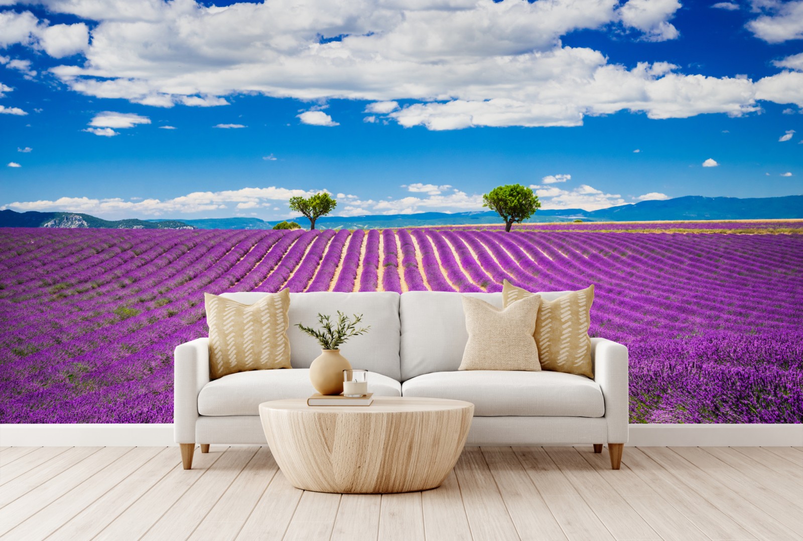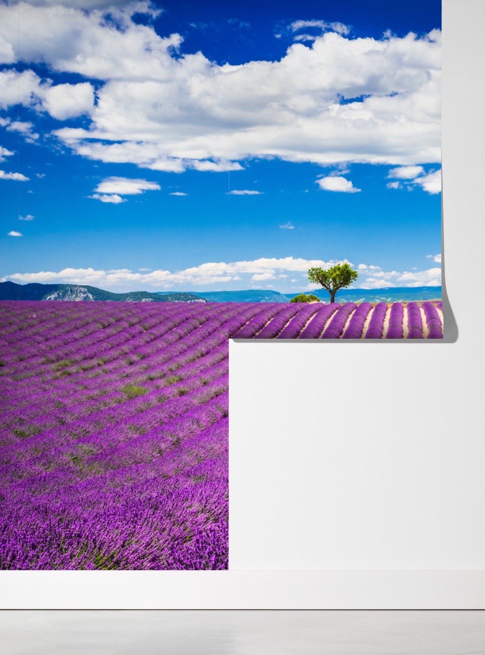 Bringen Sie ruhige provenzalische Stimmung in Ihr Zuhause mit intensiven Lavendelreihen unter weitem blauem Himmel.