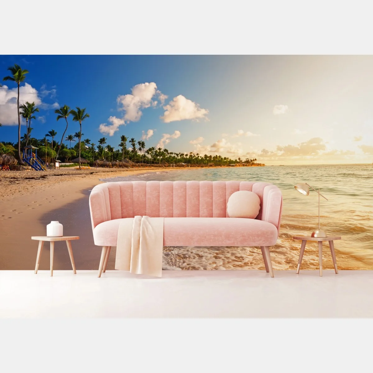 Fototapete Tropischer sonnenuntergang am strand mit palmensilhouetten