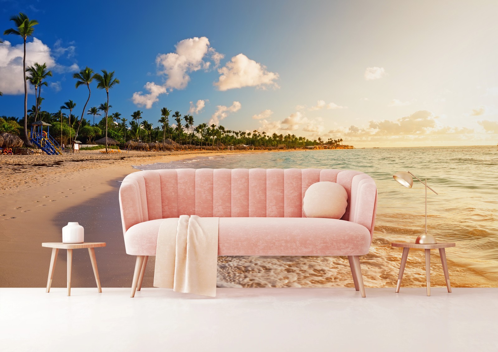 Fototapete Tropischer sonnenuntergang am strand mit palmensilhouetten