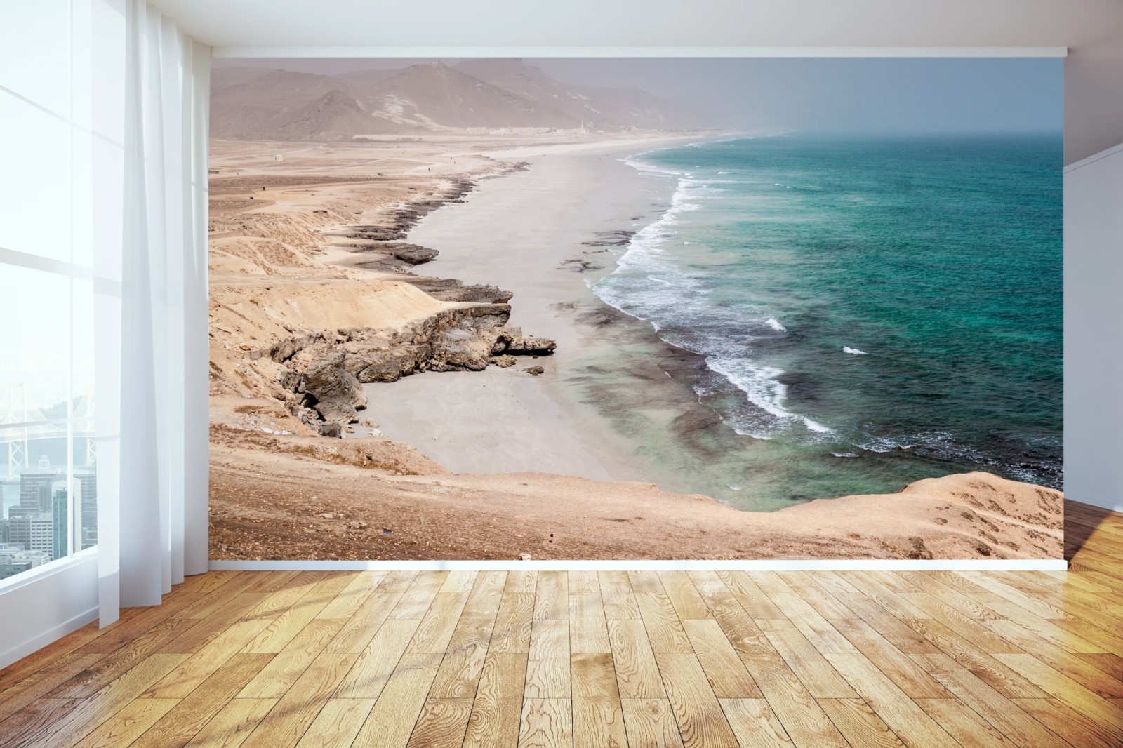 Fototapete Ruhige türkisfarbene küstenlinie über wüstenklippen