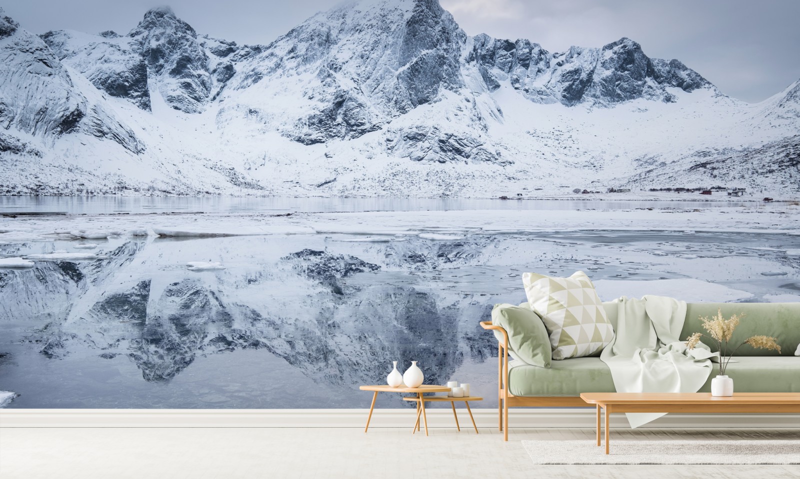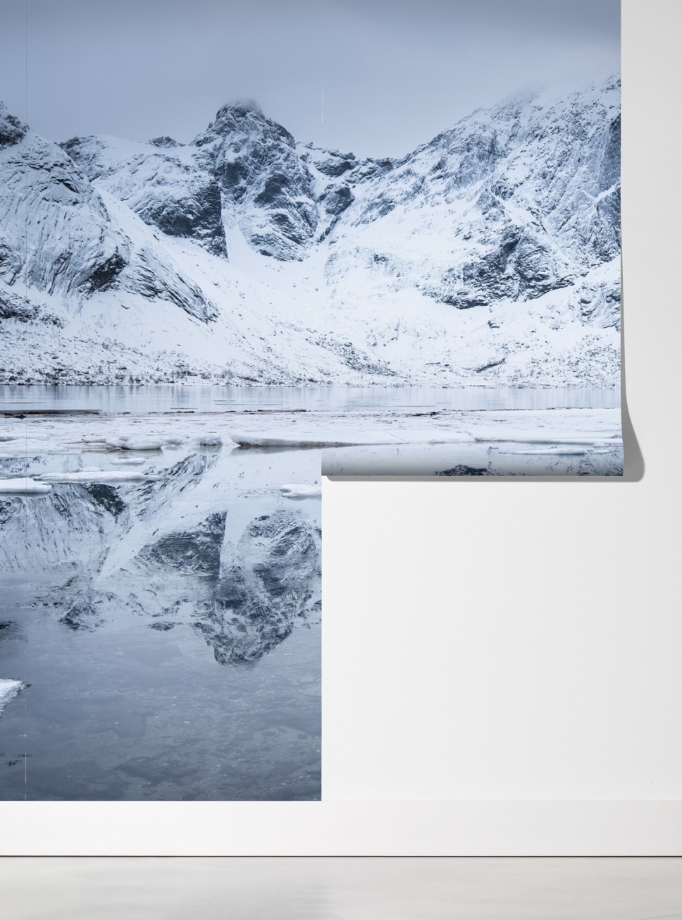Bringen Sie die ruhige Schönheit verschneiter Berggipfel und ihrer Spiegelung ins Zimmer und schaffen Sie eine nordische Atmosphäre.