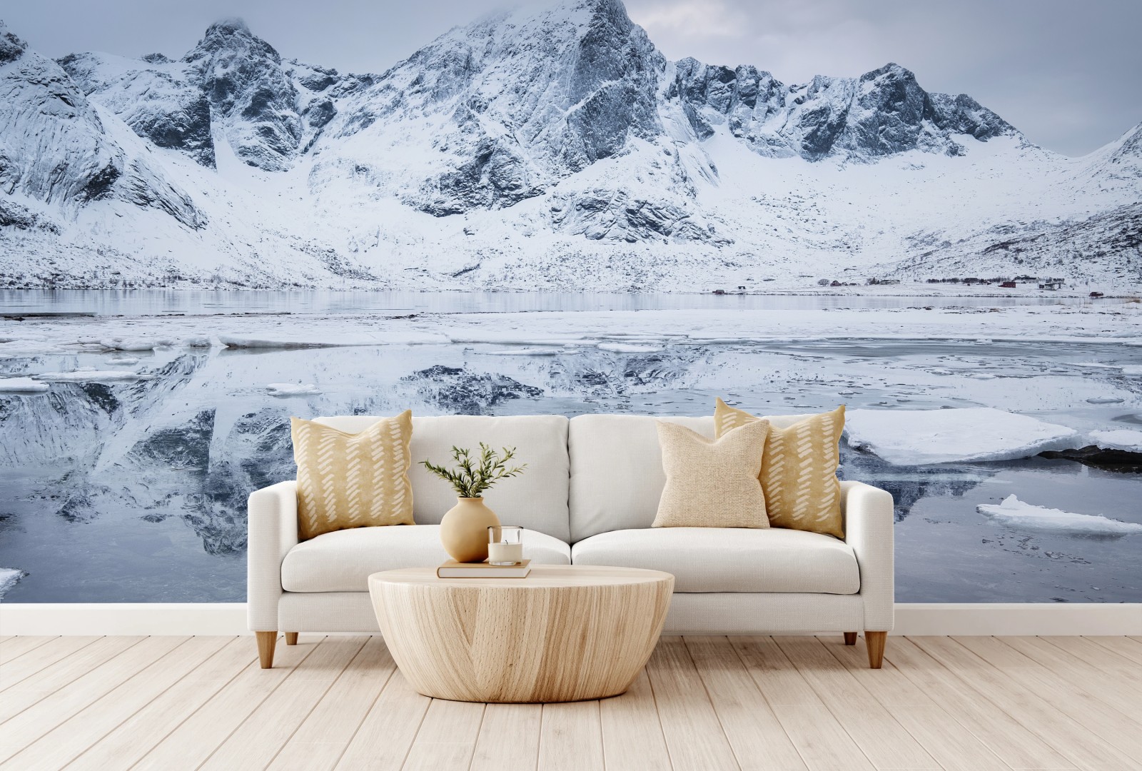 Bringen Sie die ruhige Schönheit verschneiter Berggipfel und ihrer Spiegelung ins Zimmer und schaffen Sie eine nordische Atmosphäre.MehrWeniger