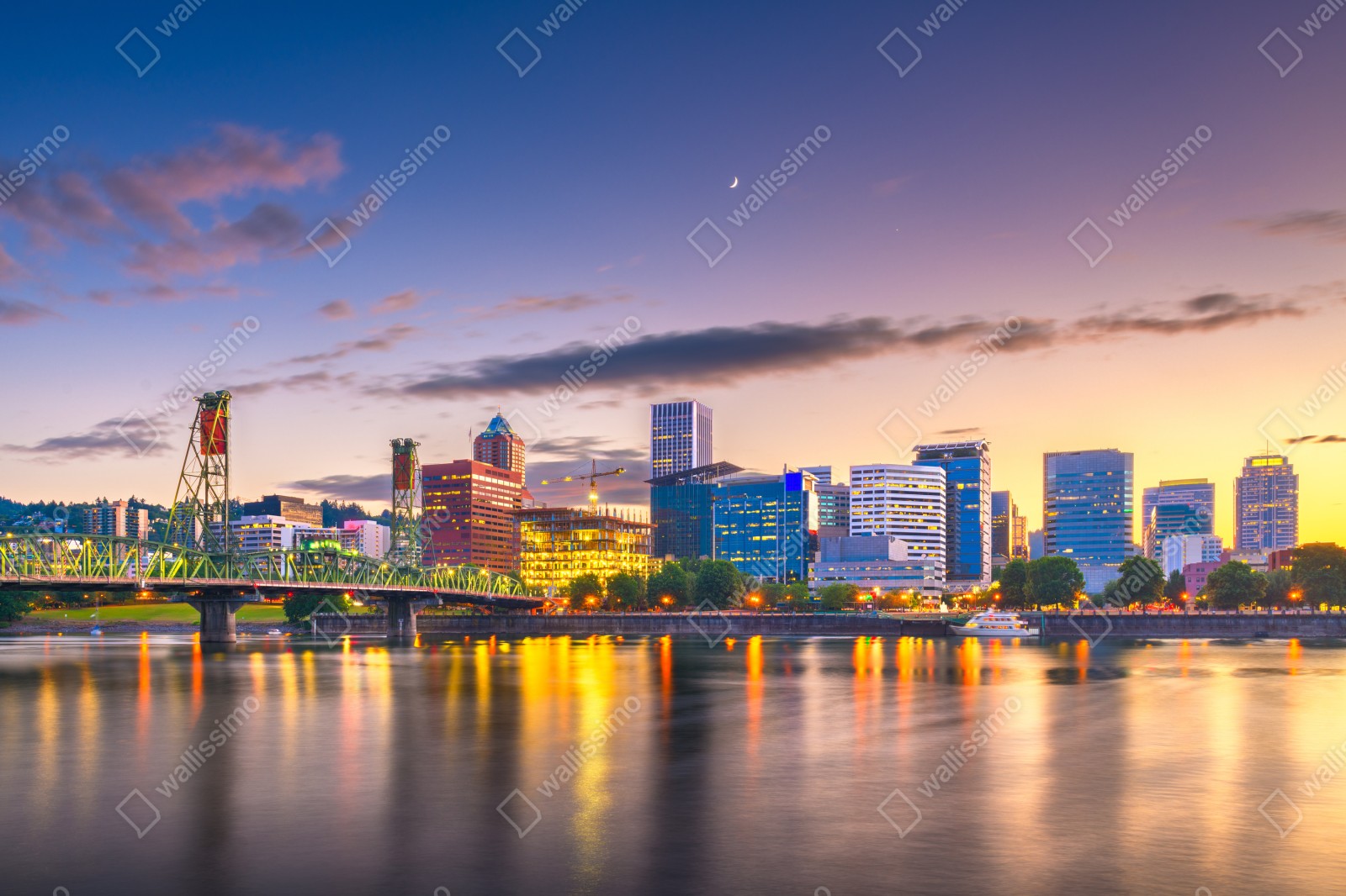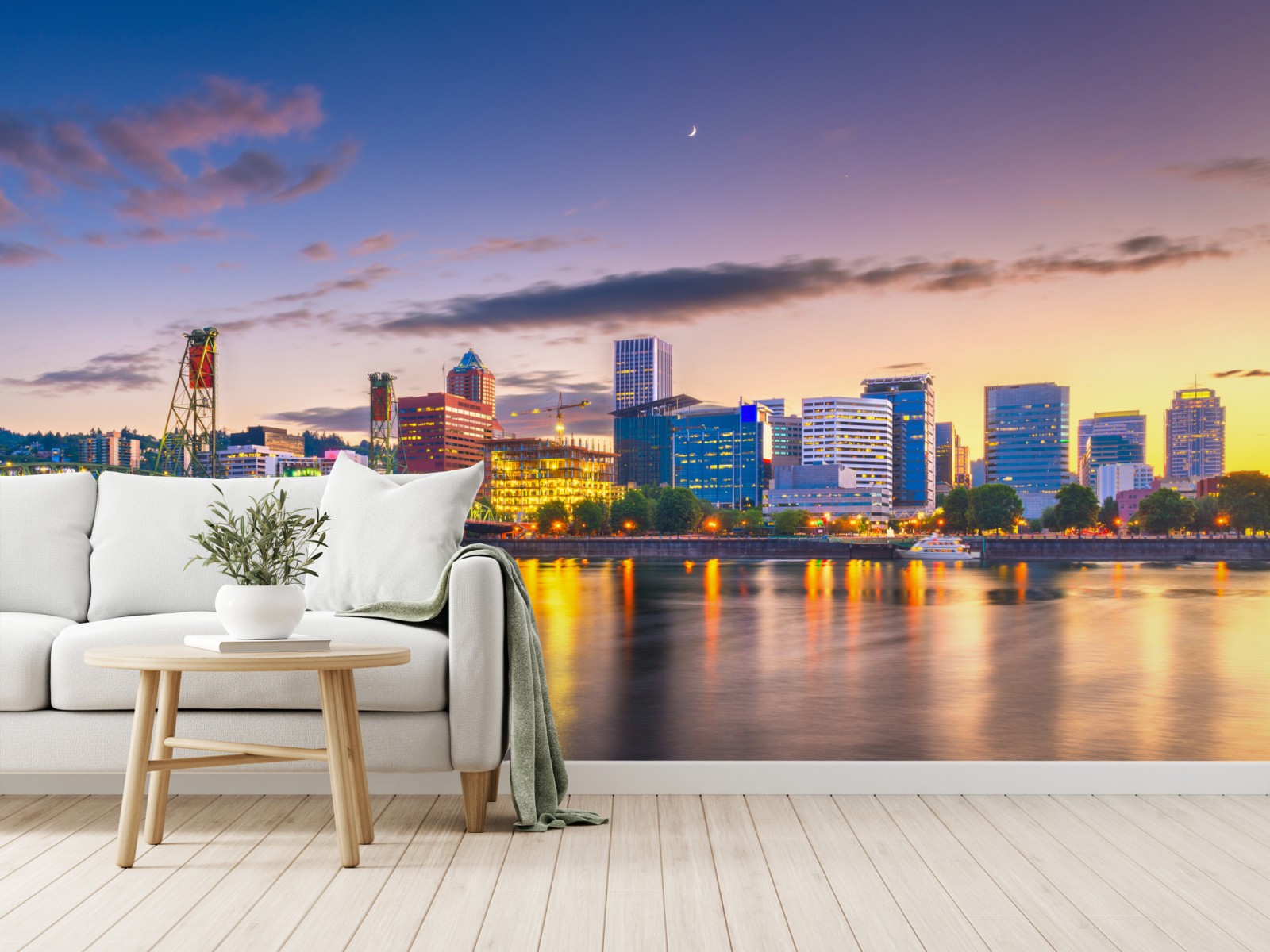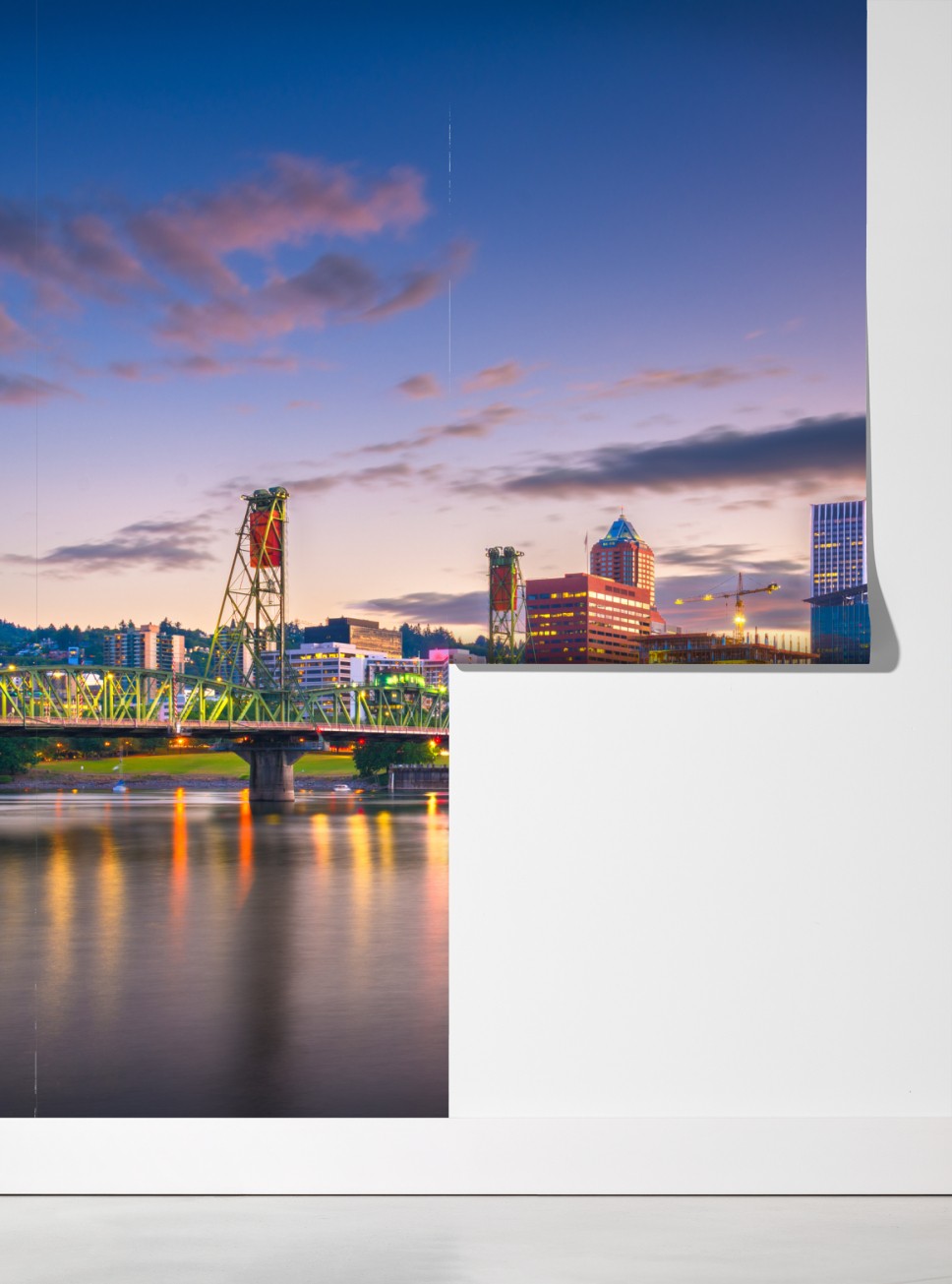 Verleihen Sie Ihrem Raum urbanen Charme mit der stimmungsvollen Skyline von Portland bei Dämmerung, die sich im Willamette widerspiegelt.