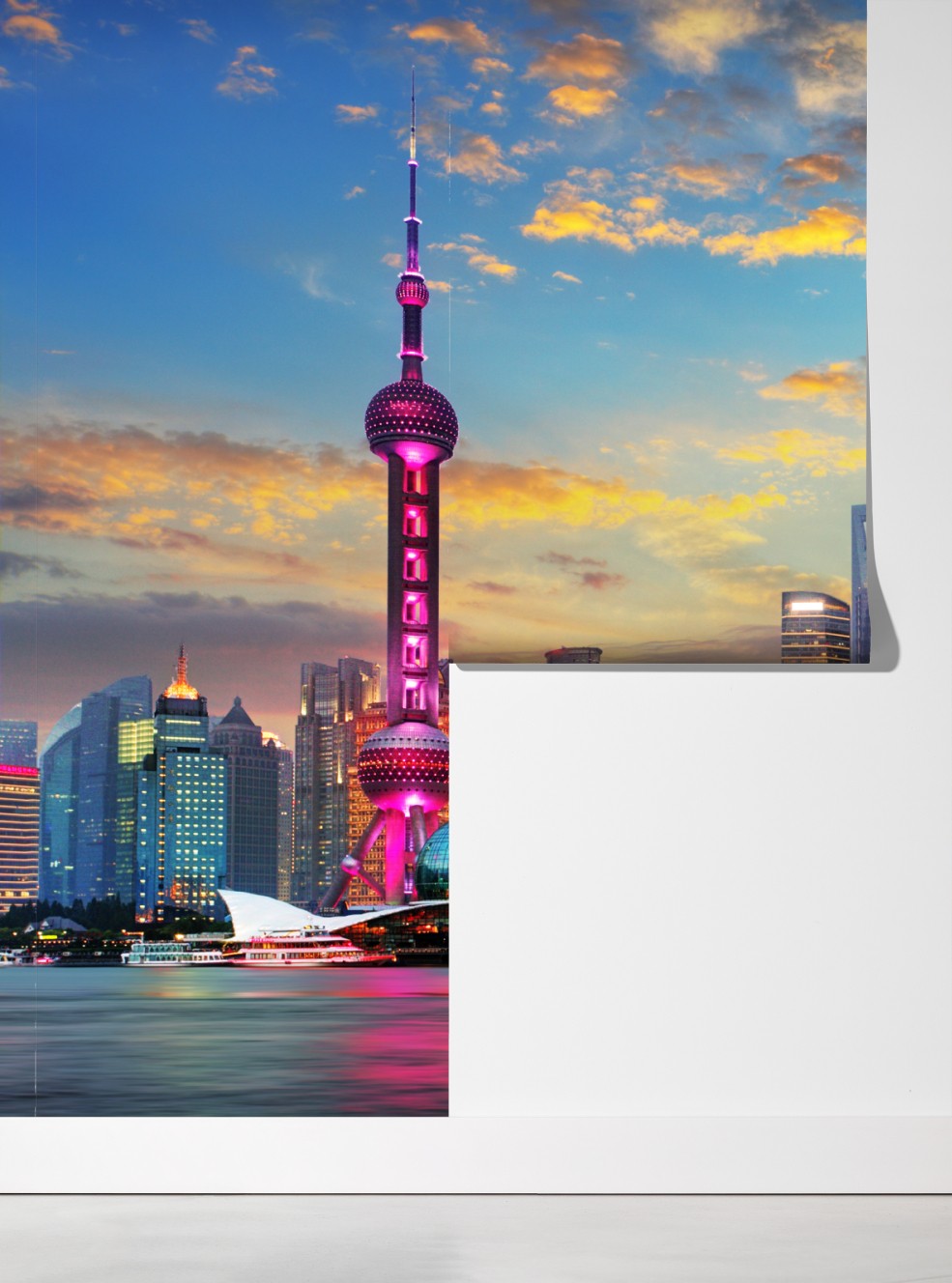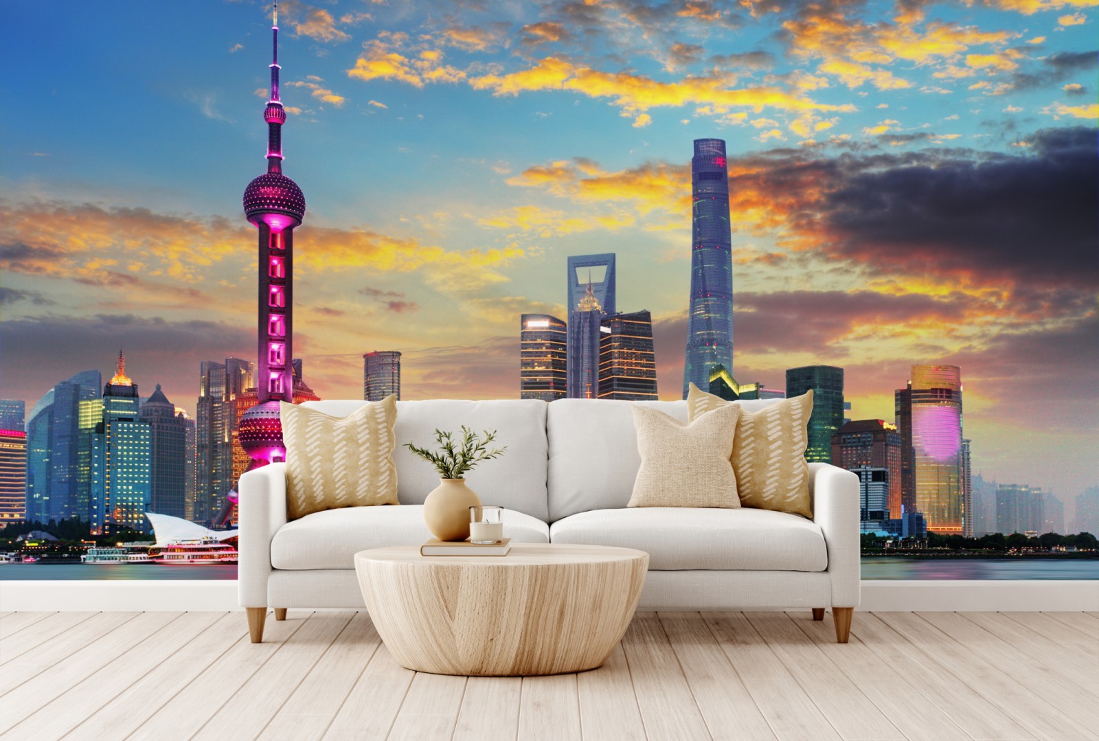 Bringen Sie die lebendige Ufer-Skyline von Shanghai bei Sonnenuntergang in Ihr Zuhause mit leuchtenden Wolkenkratzern und farbenfrohen Reflexionen.
