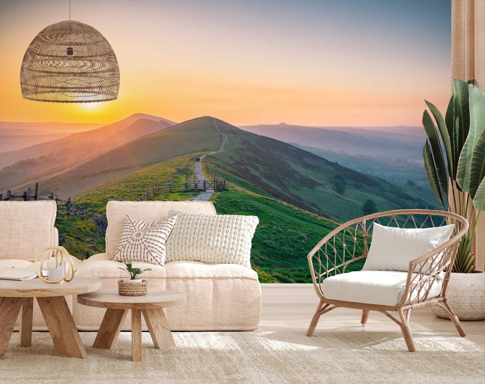 Fototapete Sonnenaufgang über grünen hügeln mit steinweg