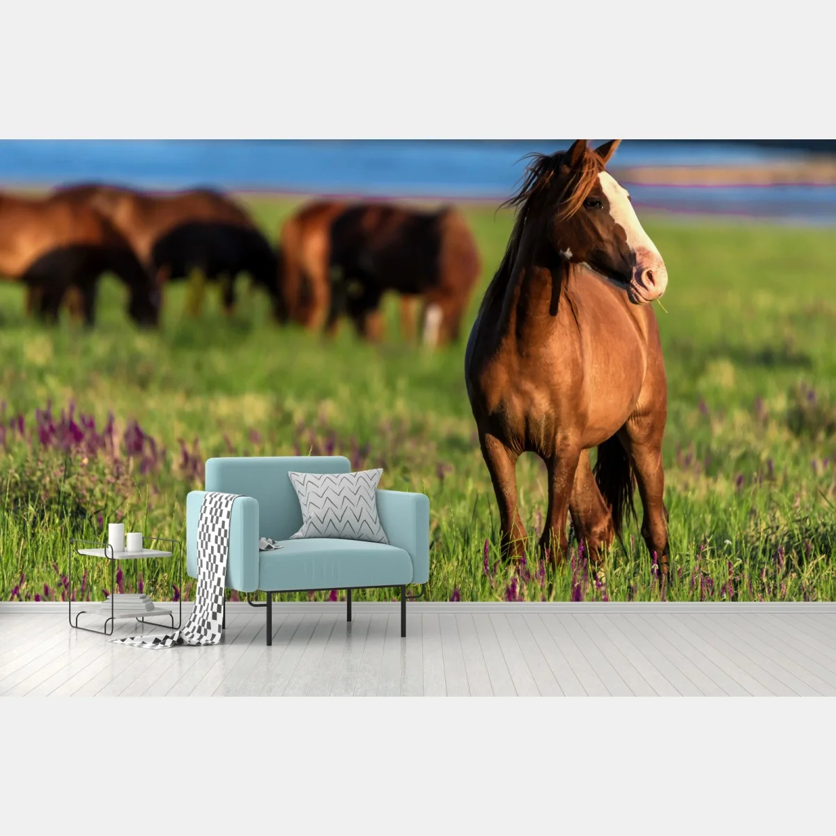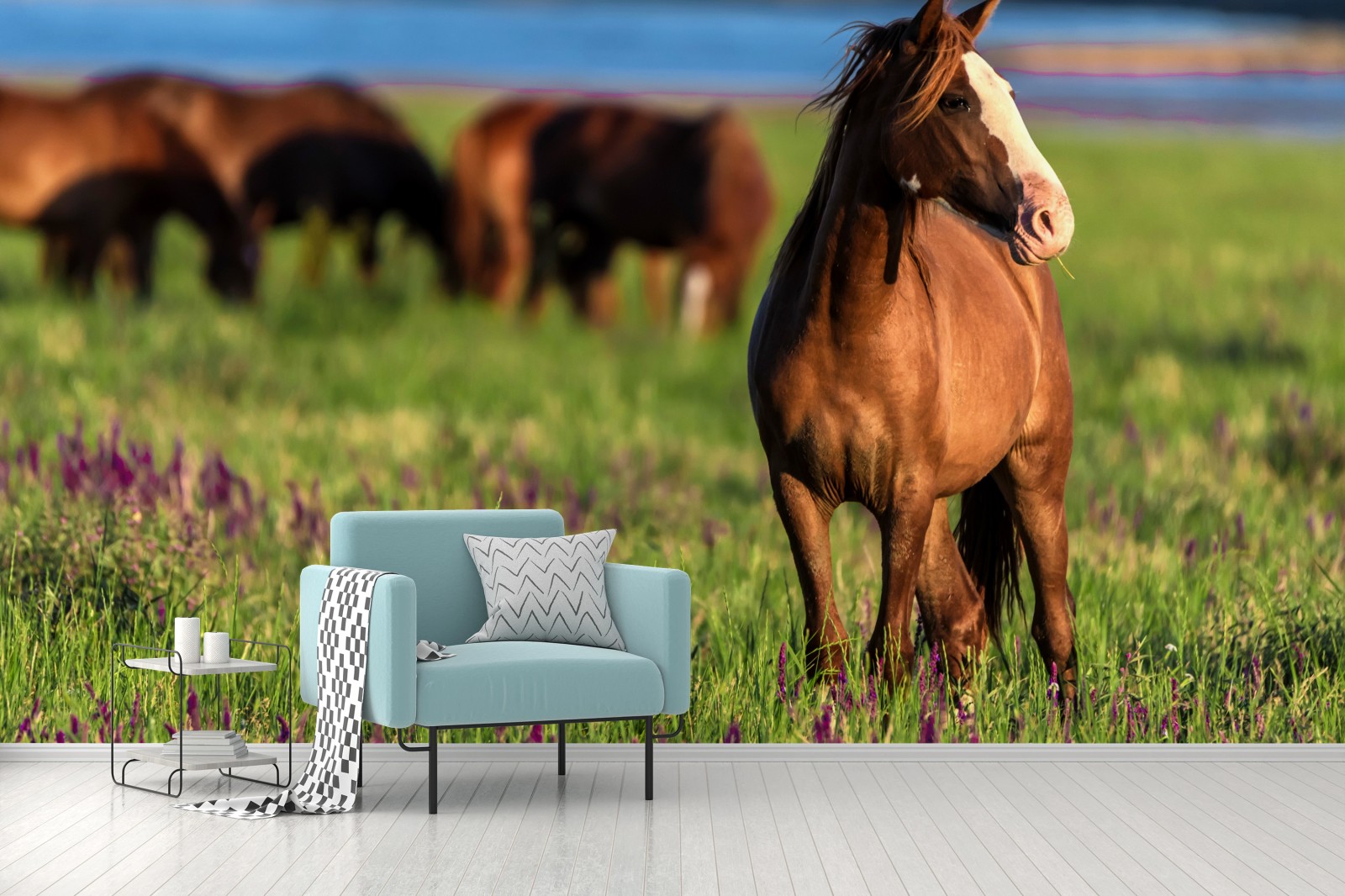 Fototapete Majestätisches braunes pferd auf einer sonnenbeschienenen wiese