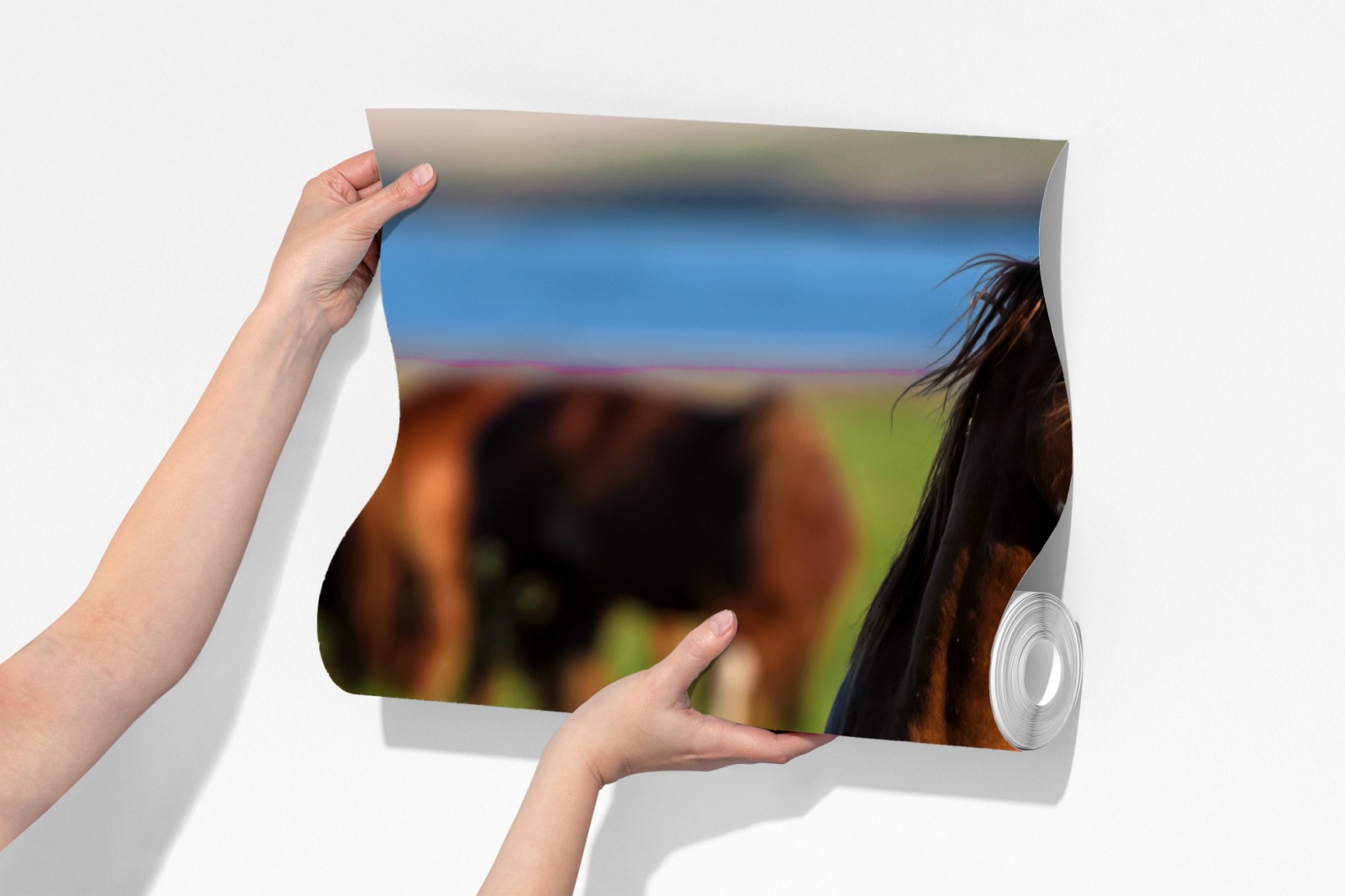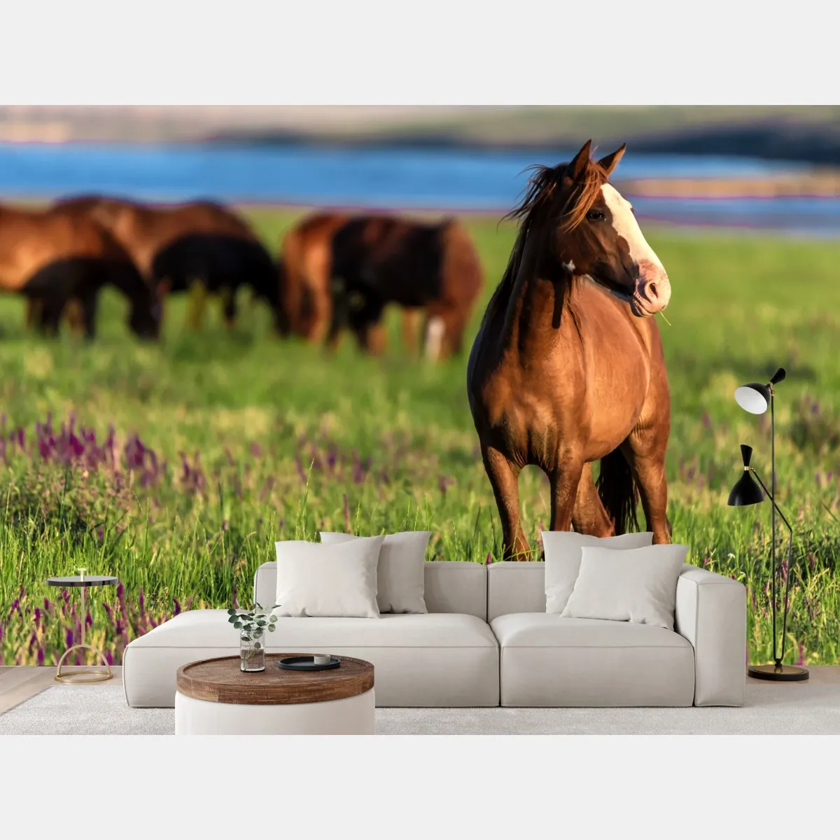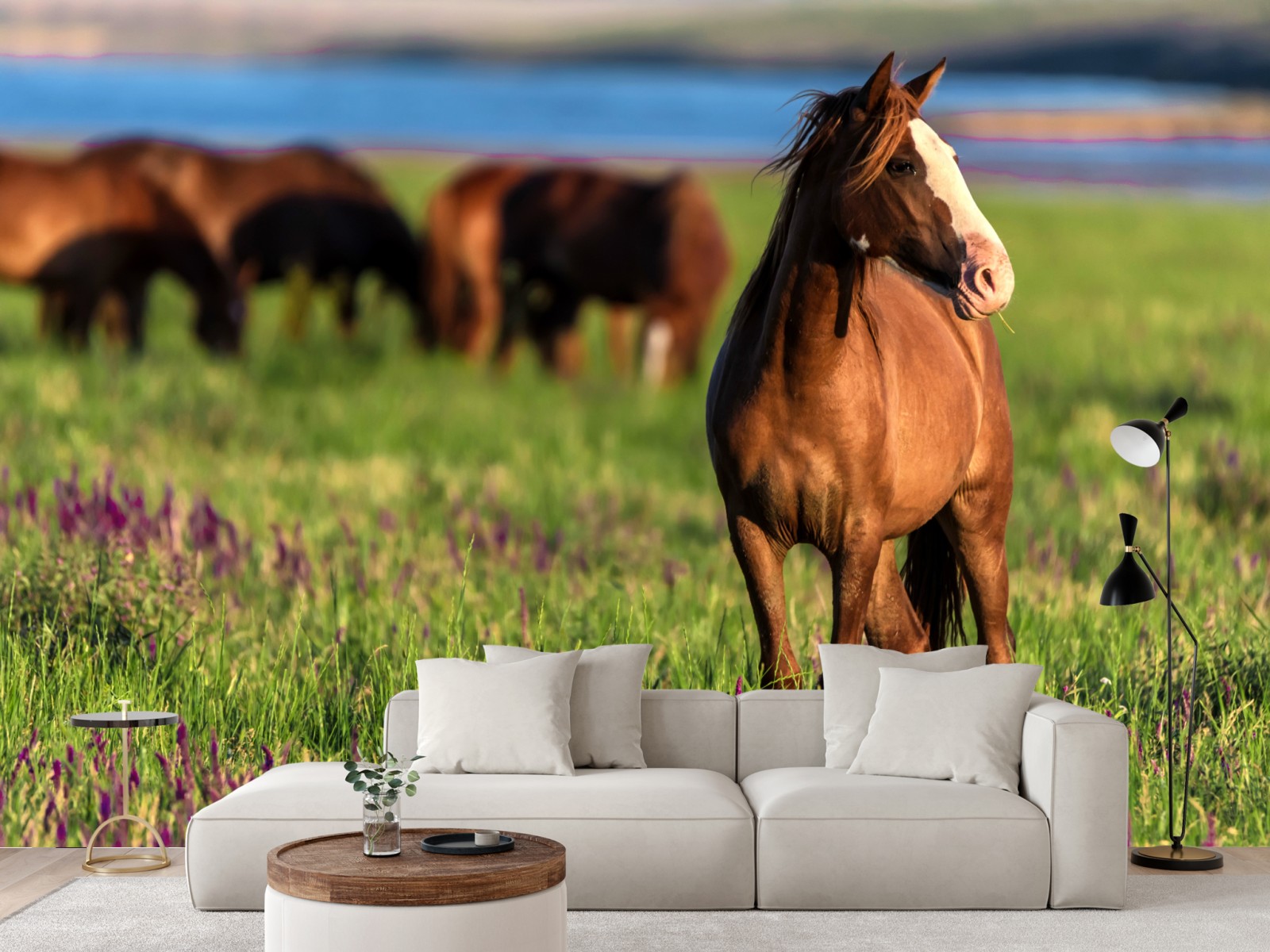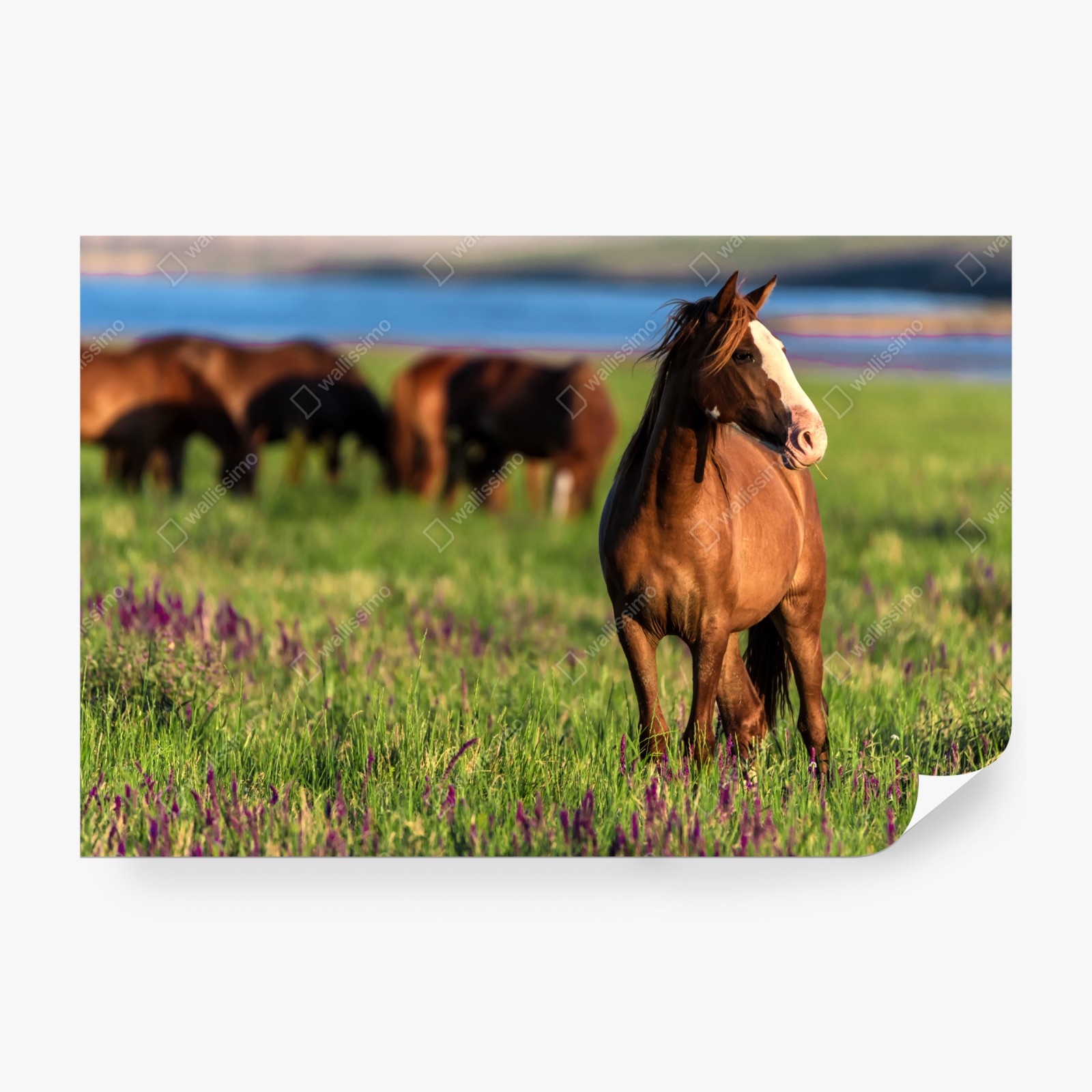 Fototapete majestätisches braunes pferd auf einer sonnenbeschienenen wiese