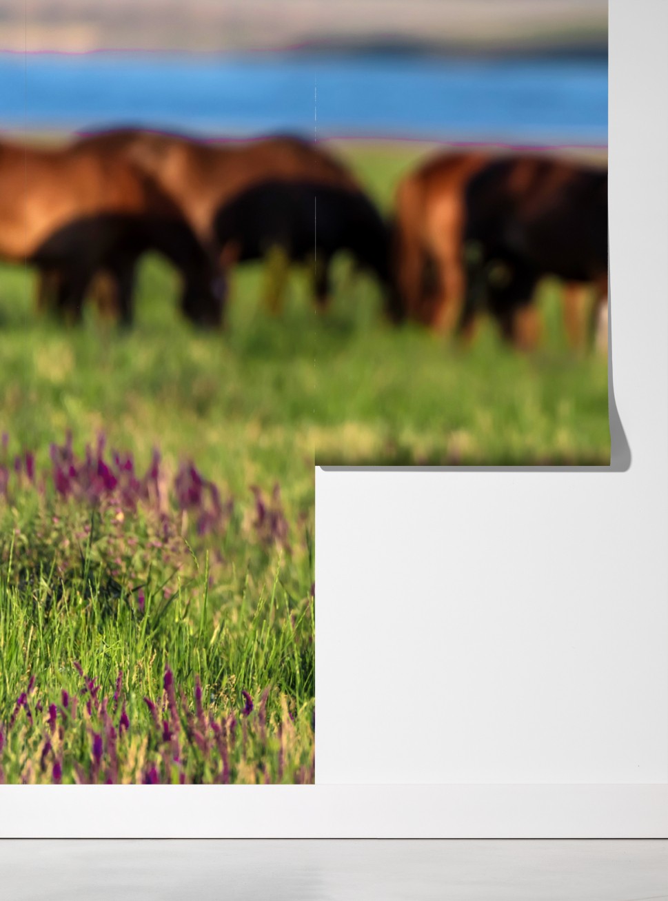 Bringen Sie die Ruhe der Landschaft an Ihre Wände mit diesem lebendigen Foto eines Pferdes, das auf einer sonnenbeschienenen Wiese grast.