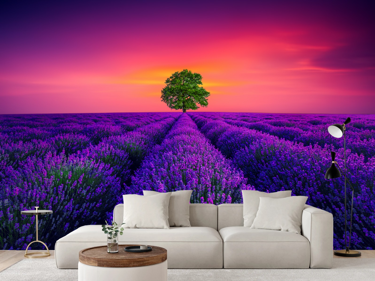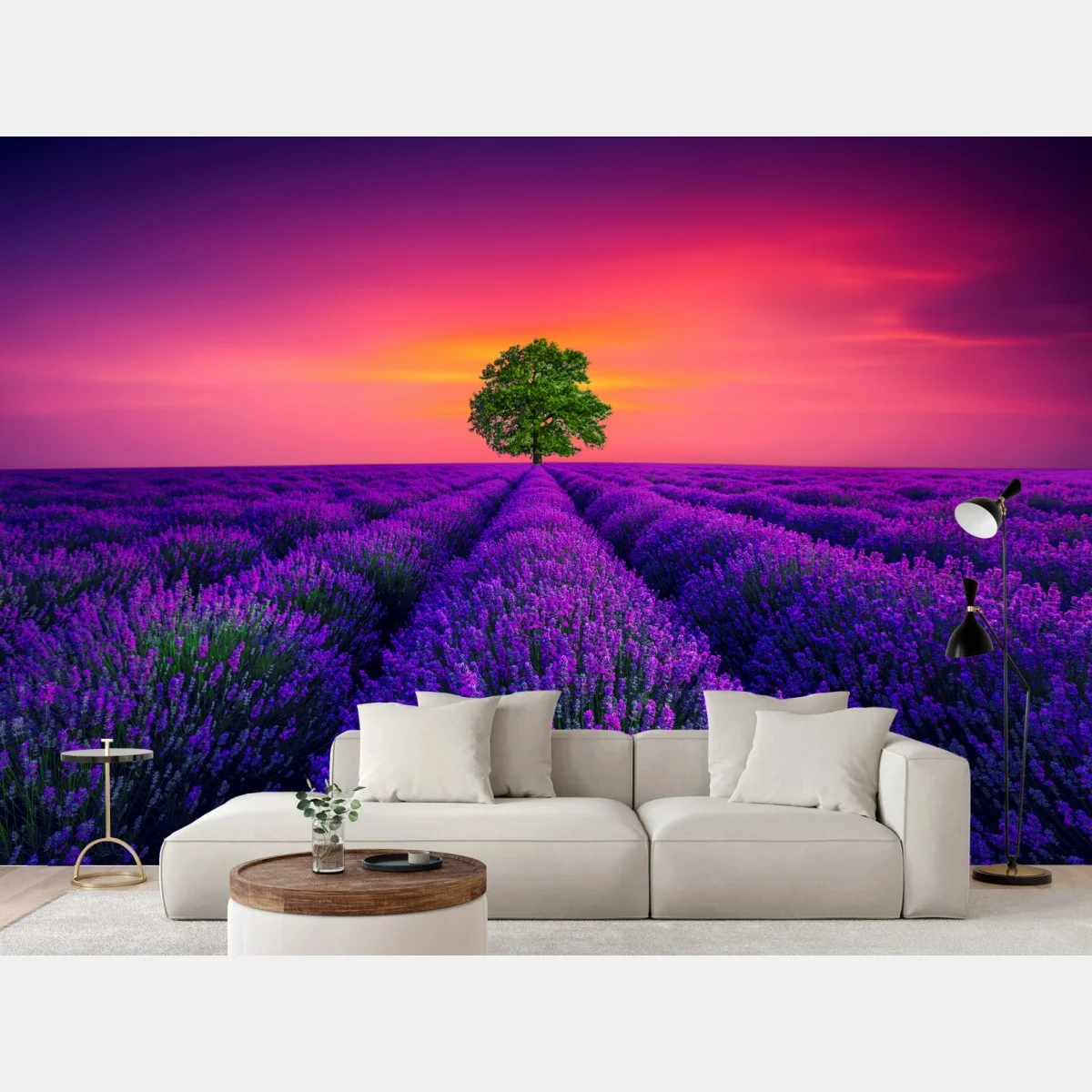 Fototapete Lavendelfeld bei sonnenuntergang mit einsamem baum