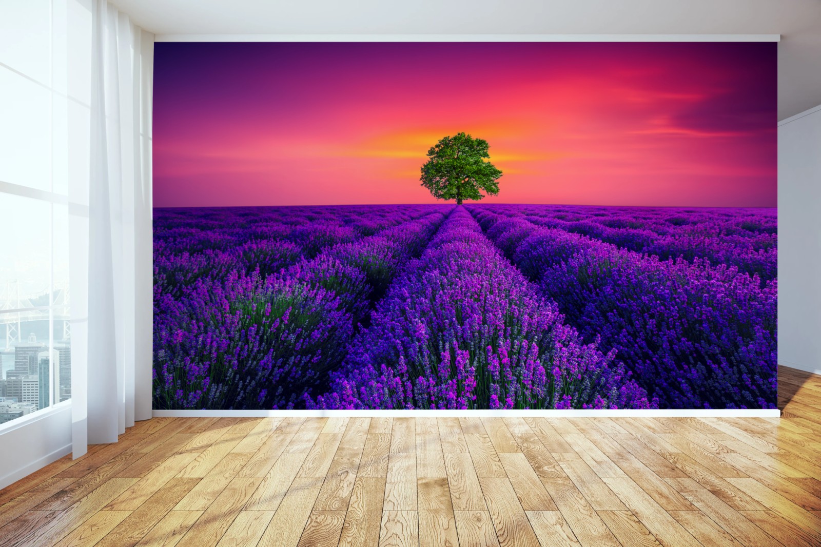 Fototapete Lavendelfeld bei sonnenuntergang mit einsamem baum