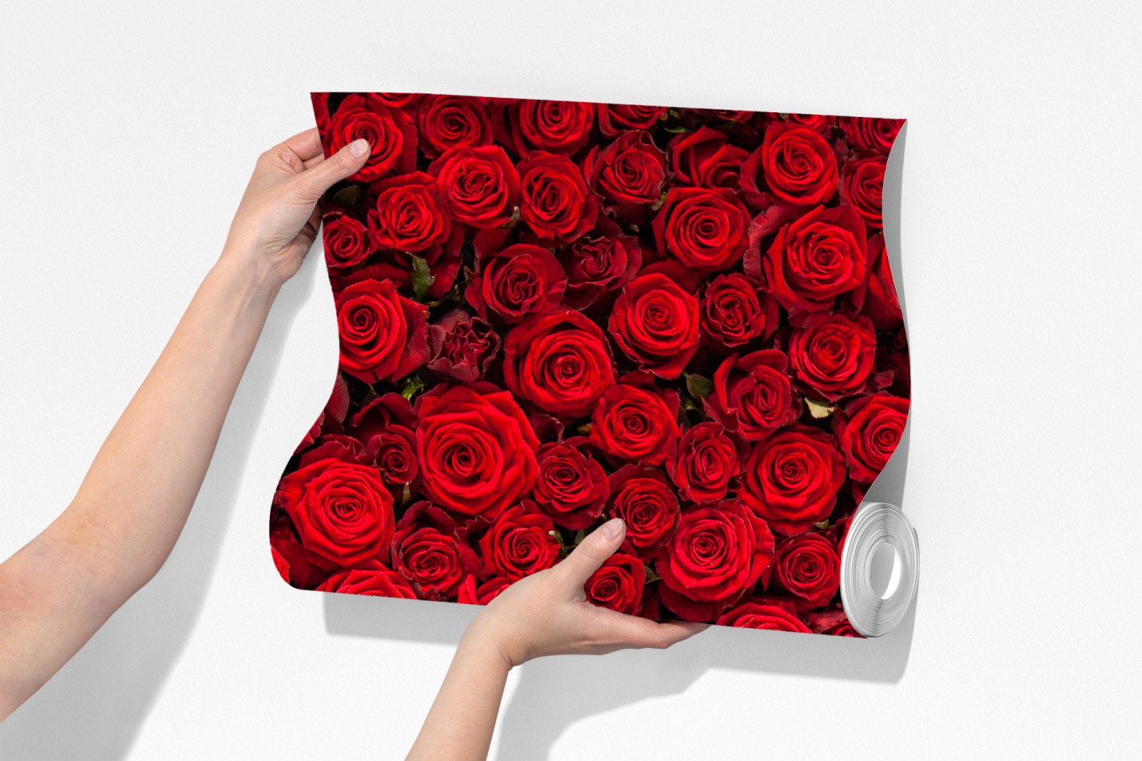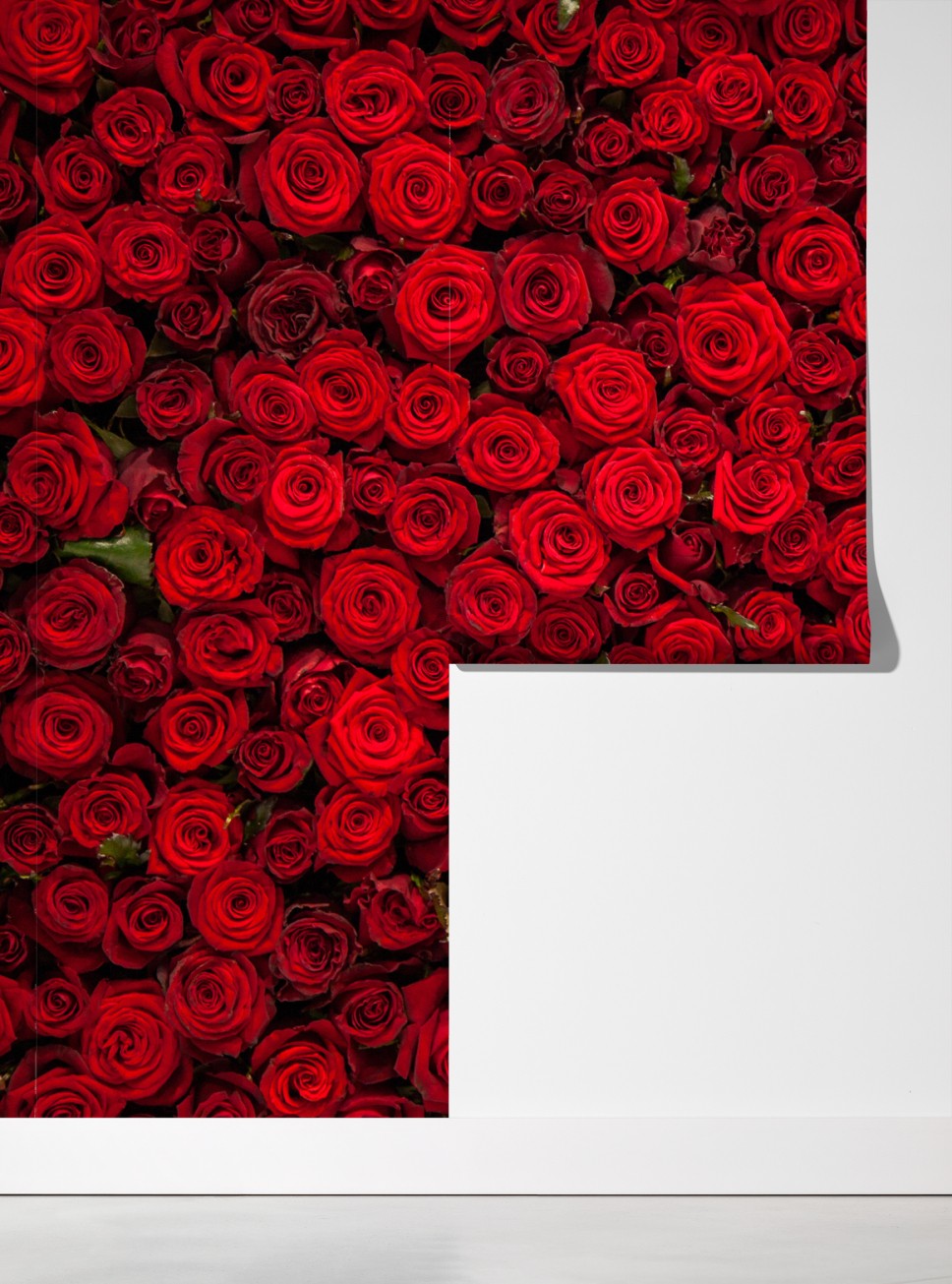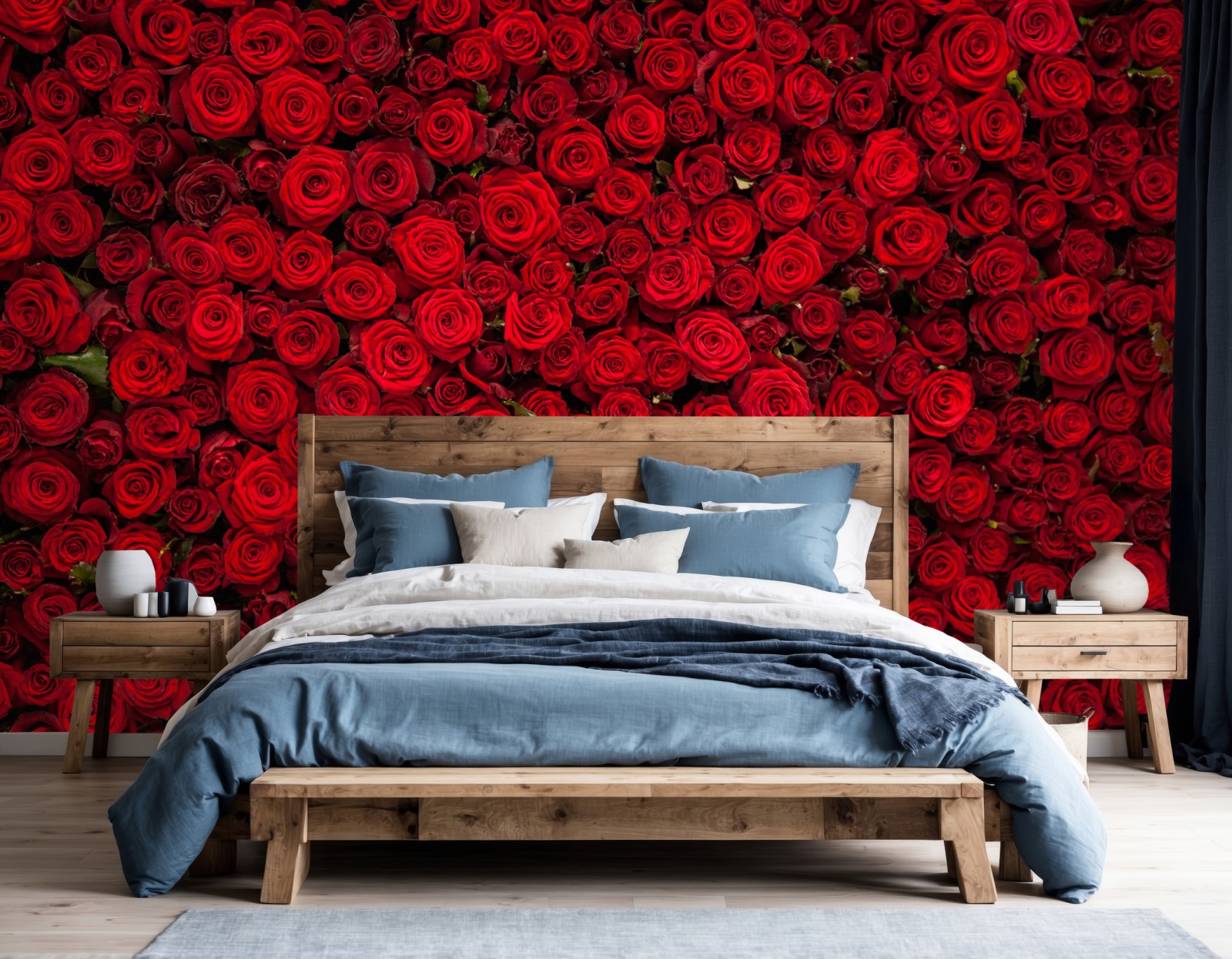 Bringen Sie zeitlose Romantik in Ihr Zuhause mit einer üppigen Wand aus leuchtend roten Rosen, ideal um jedem Raum Wärme und Eleganz zu verleihen.