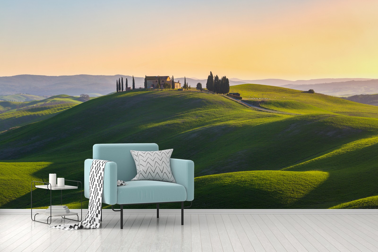 Fototapete Bauernhaus auf grünen hügeln, Crete Senesi