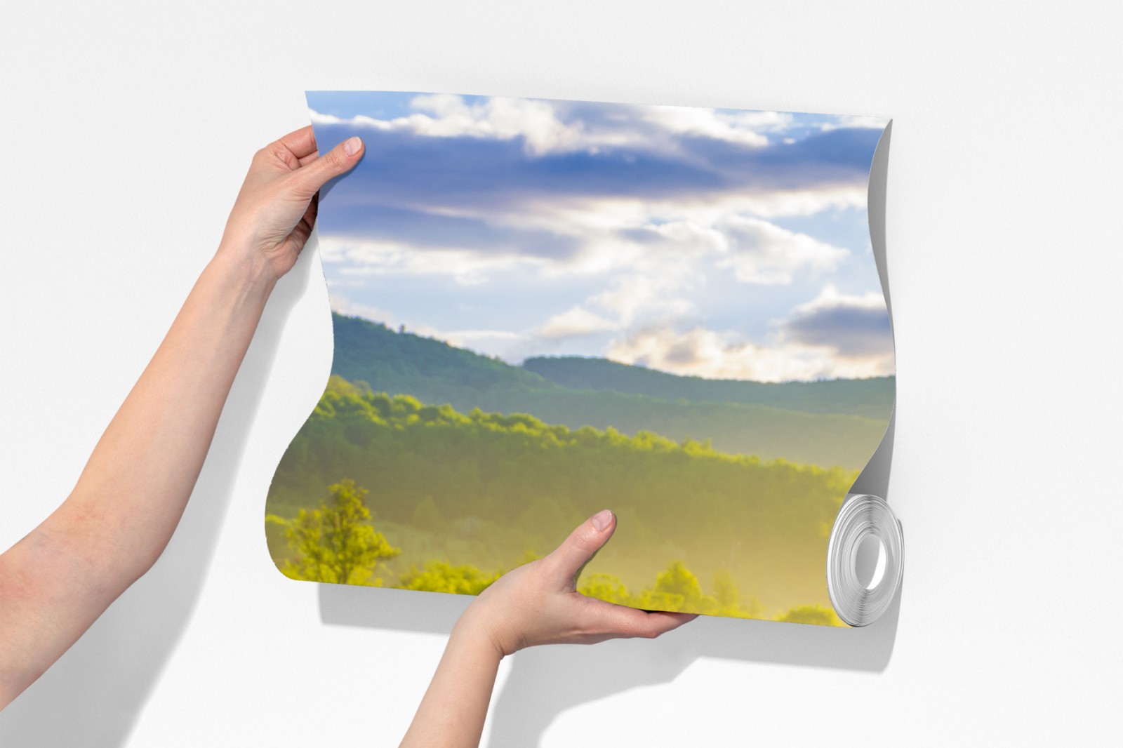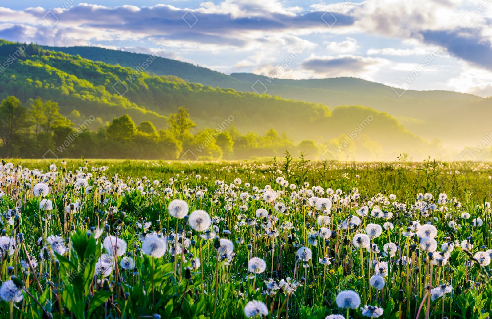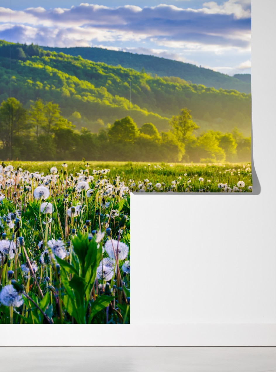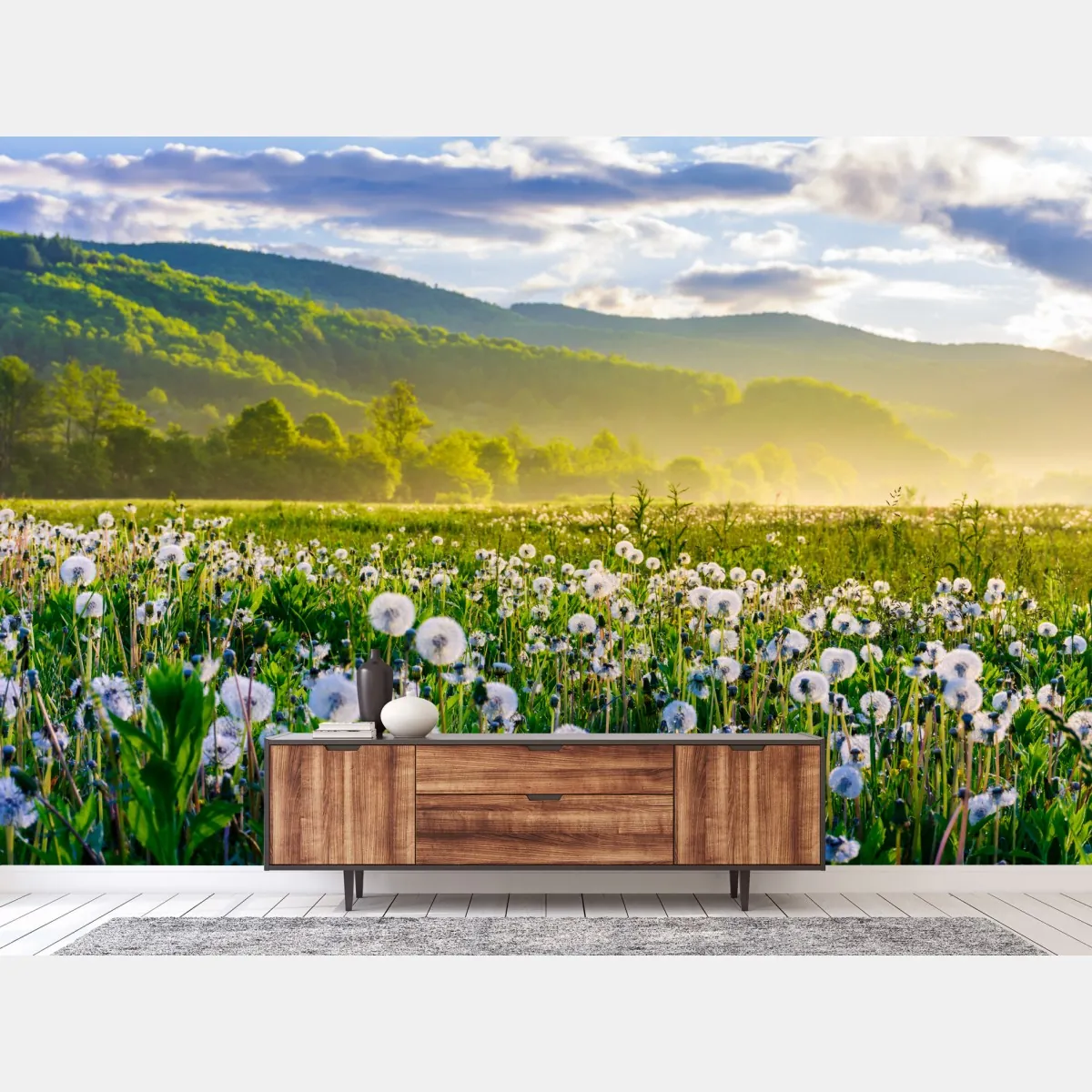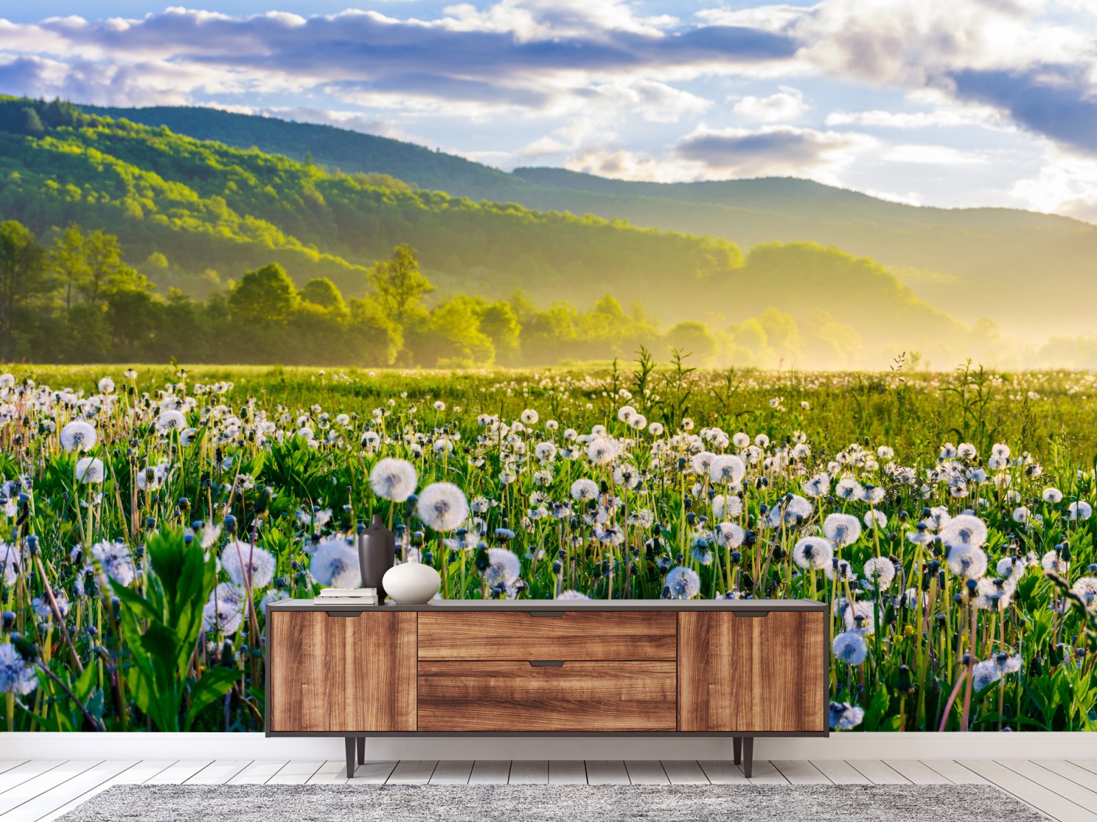 Fototapete neblige löwenzahnwiese im sonnenaufgang – Wallnifity®