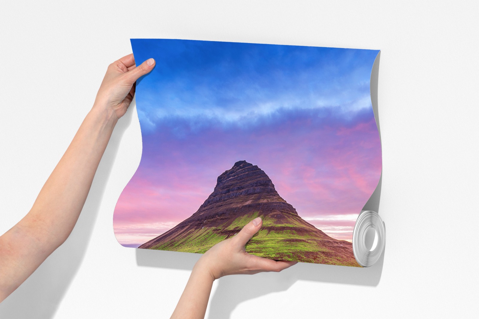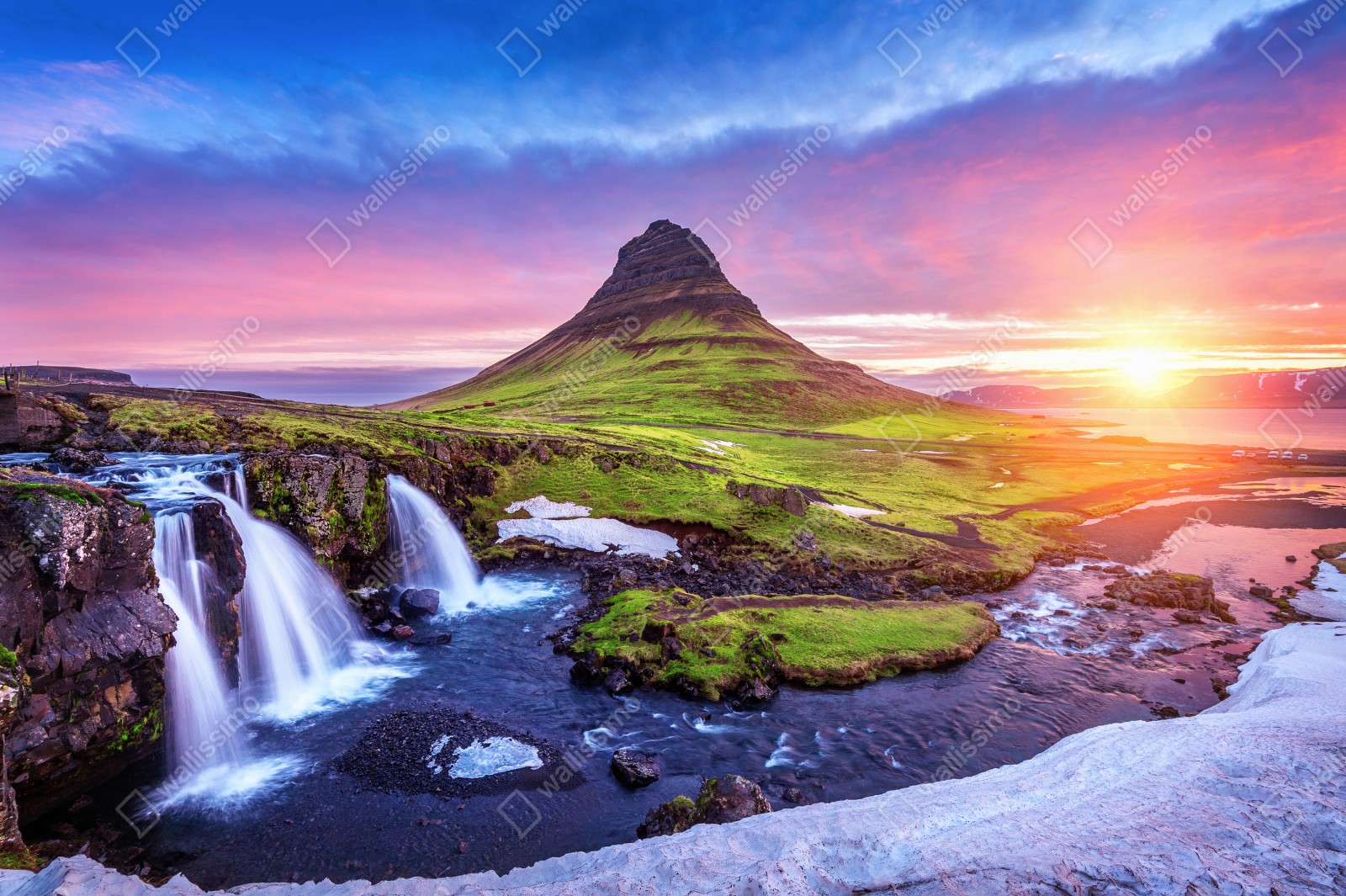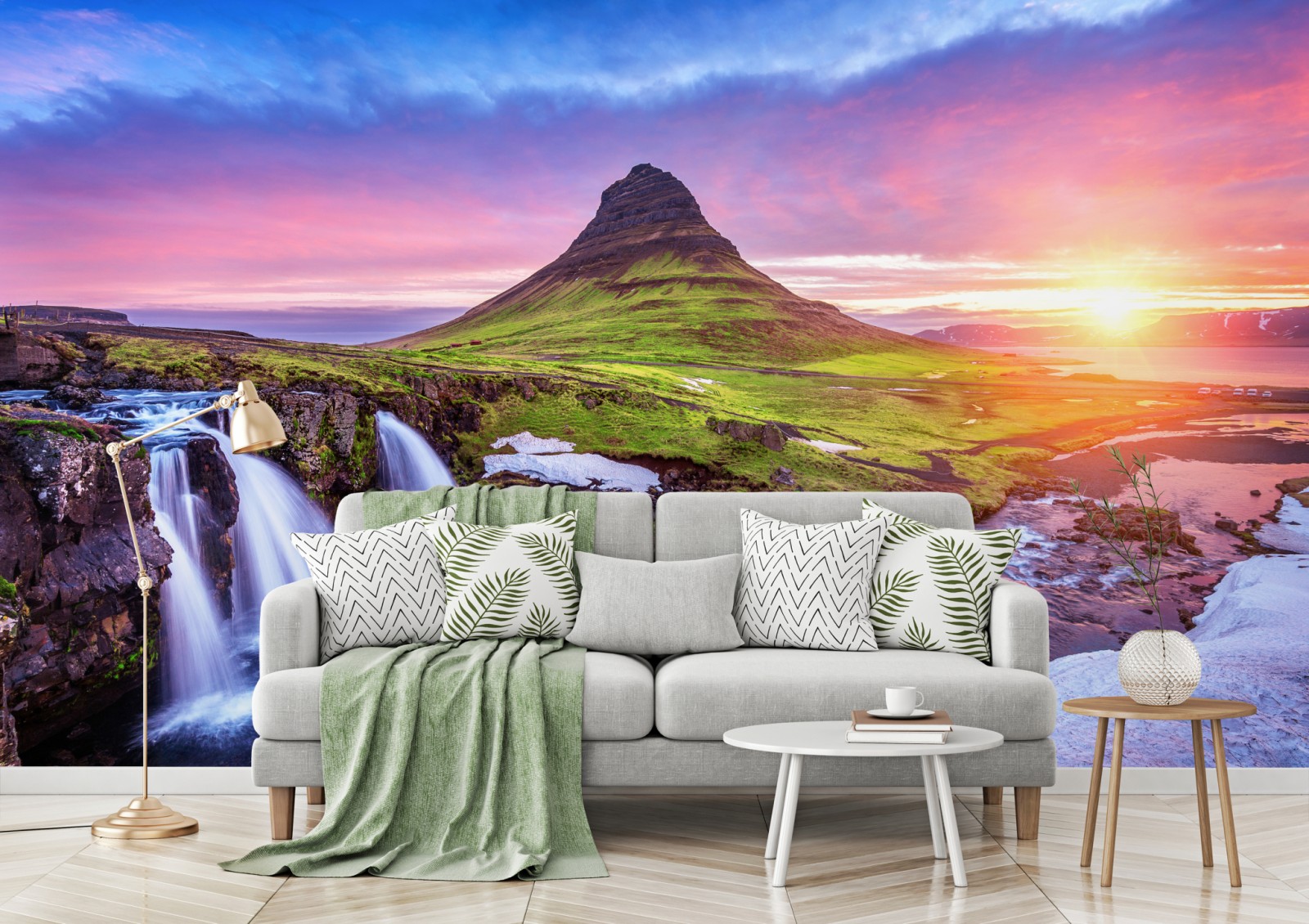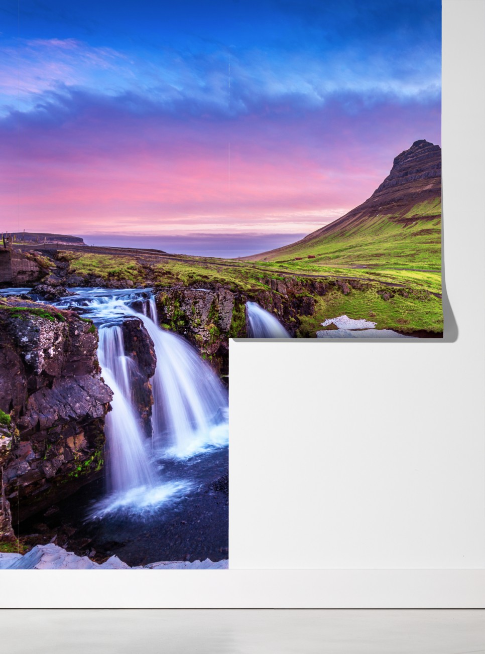 Bringen Sie die ruhige Schönheit von Kirkjufell bei Sonnenaufgang in Ihr Zuhause mit lebendigen Farben und dramatischer Komposition.
