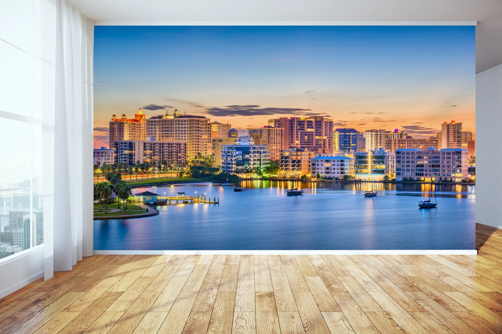 Erleben Sie die ruhige Schönheit von Sarasota bei Dämmerung mit lebendiger Stadtskyline und sanften Spiegelungen auf der Bucht, ideal für moderne Wanddekoration.MehrWeniger