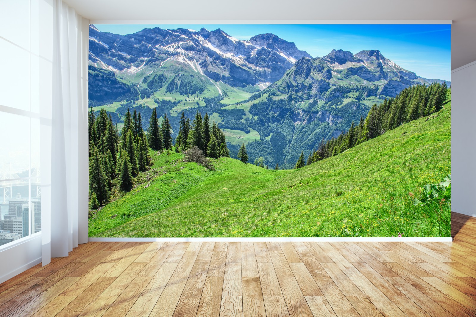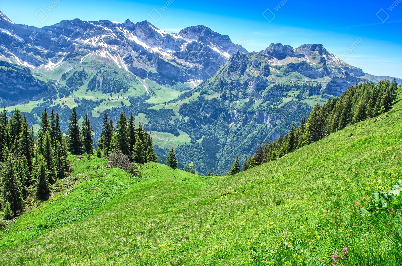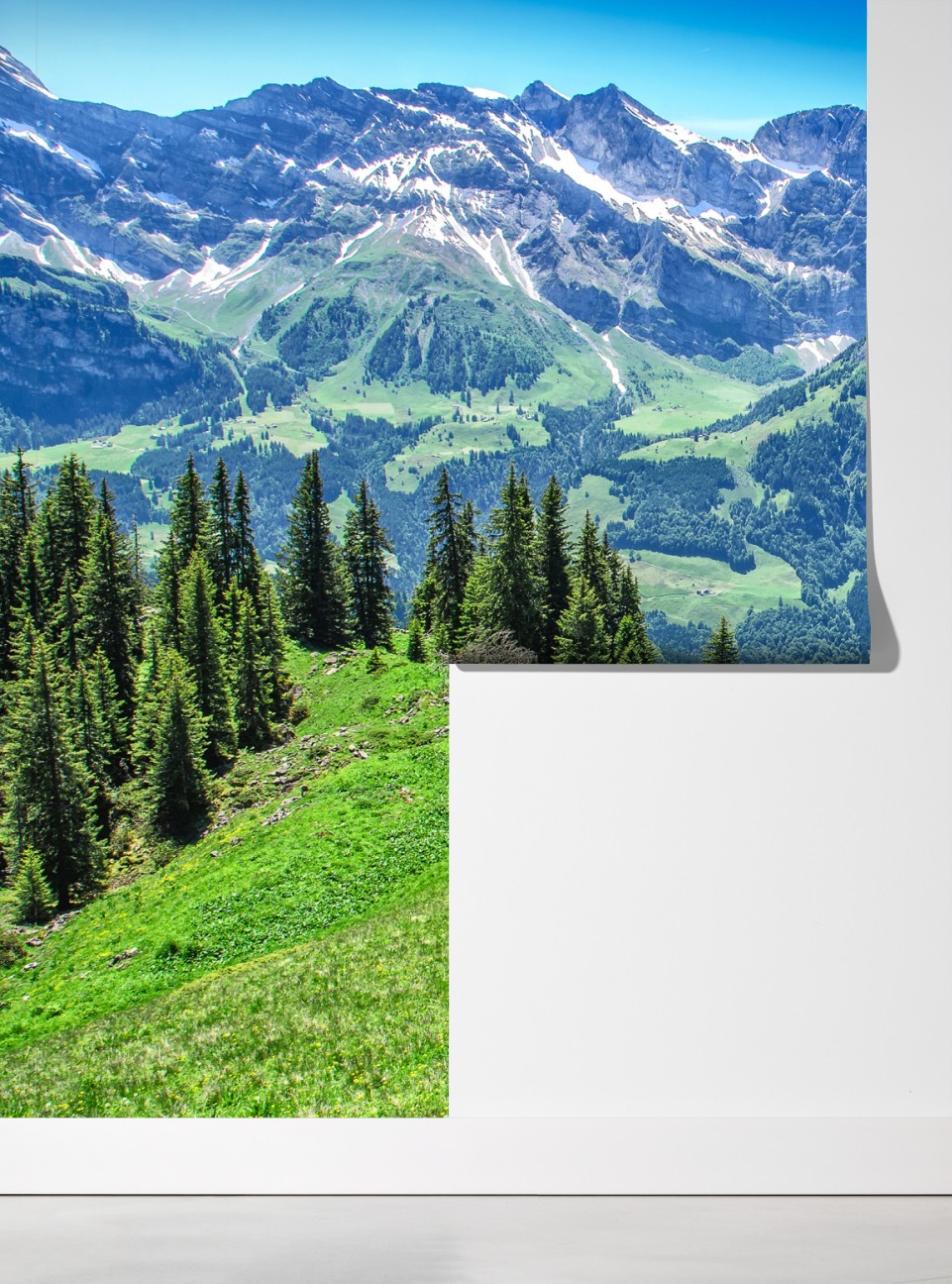 Bringen Sie die ruhige Schönheit der Schweizer Alpen in Ihr Zuhause mit diesem lebendigen Panoramafoto, das üppige Wiesen, schroffe Gipfel und klaren Sommerhimmel zeigt.