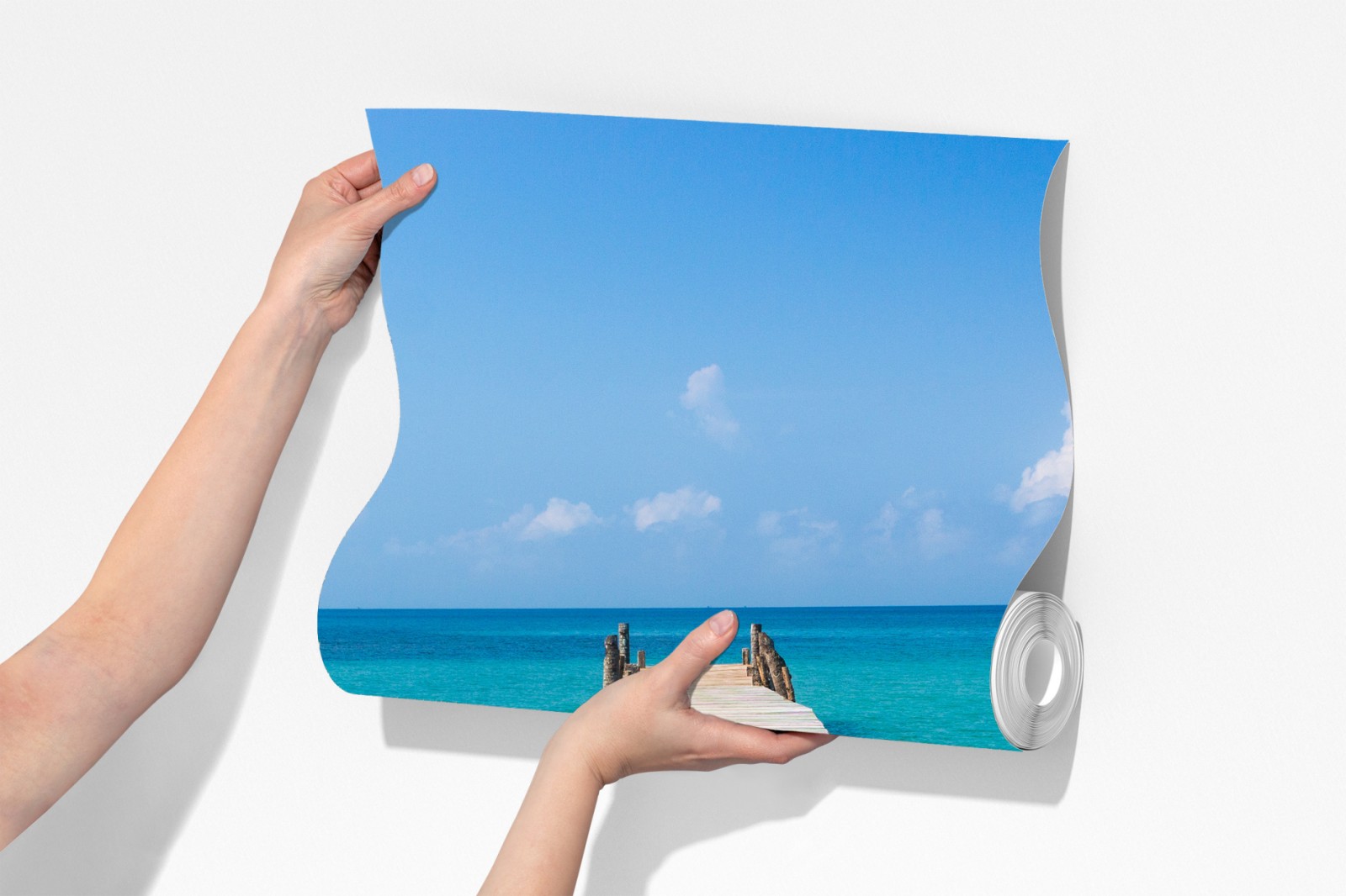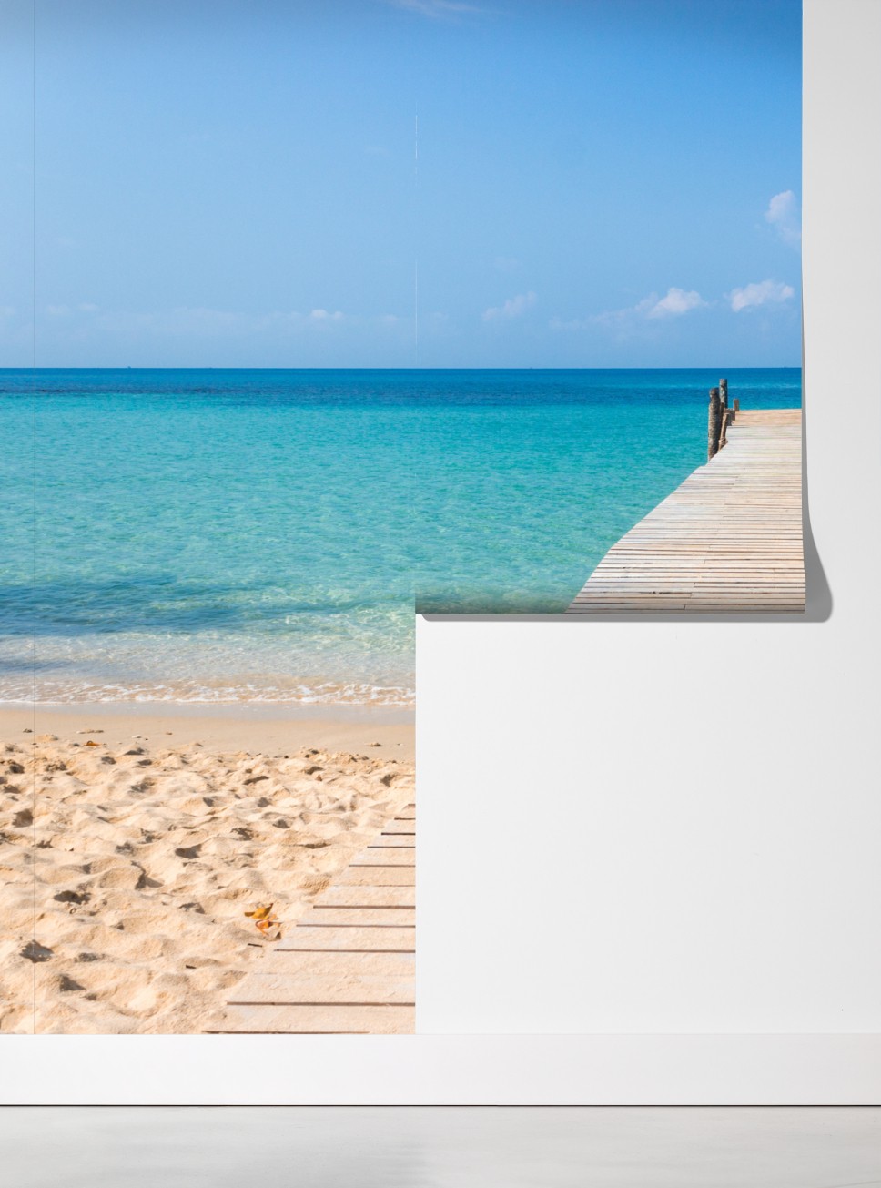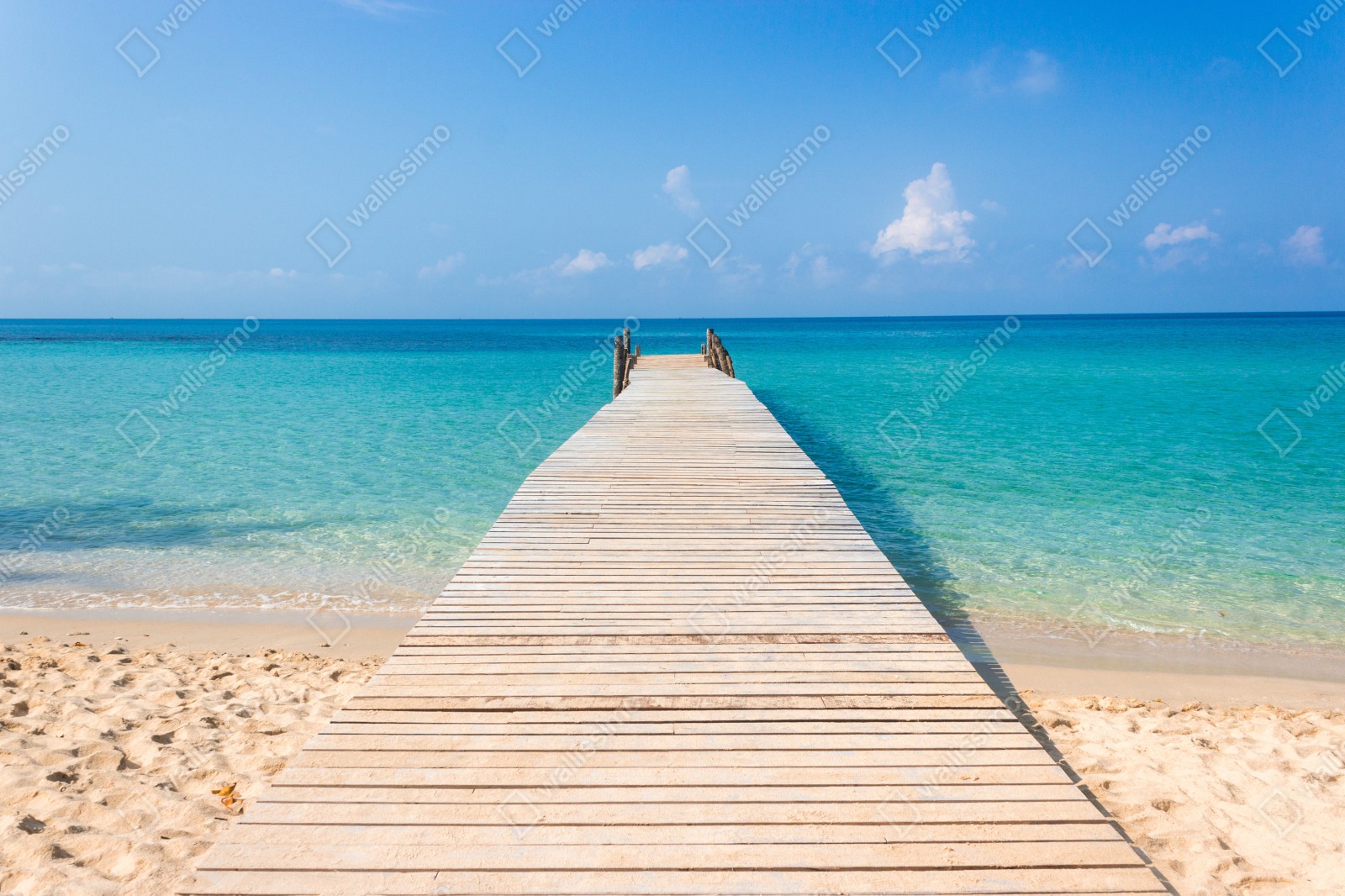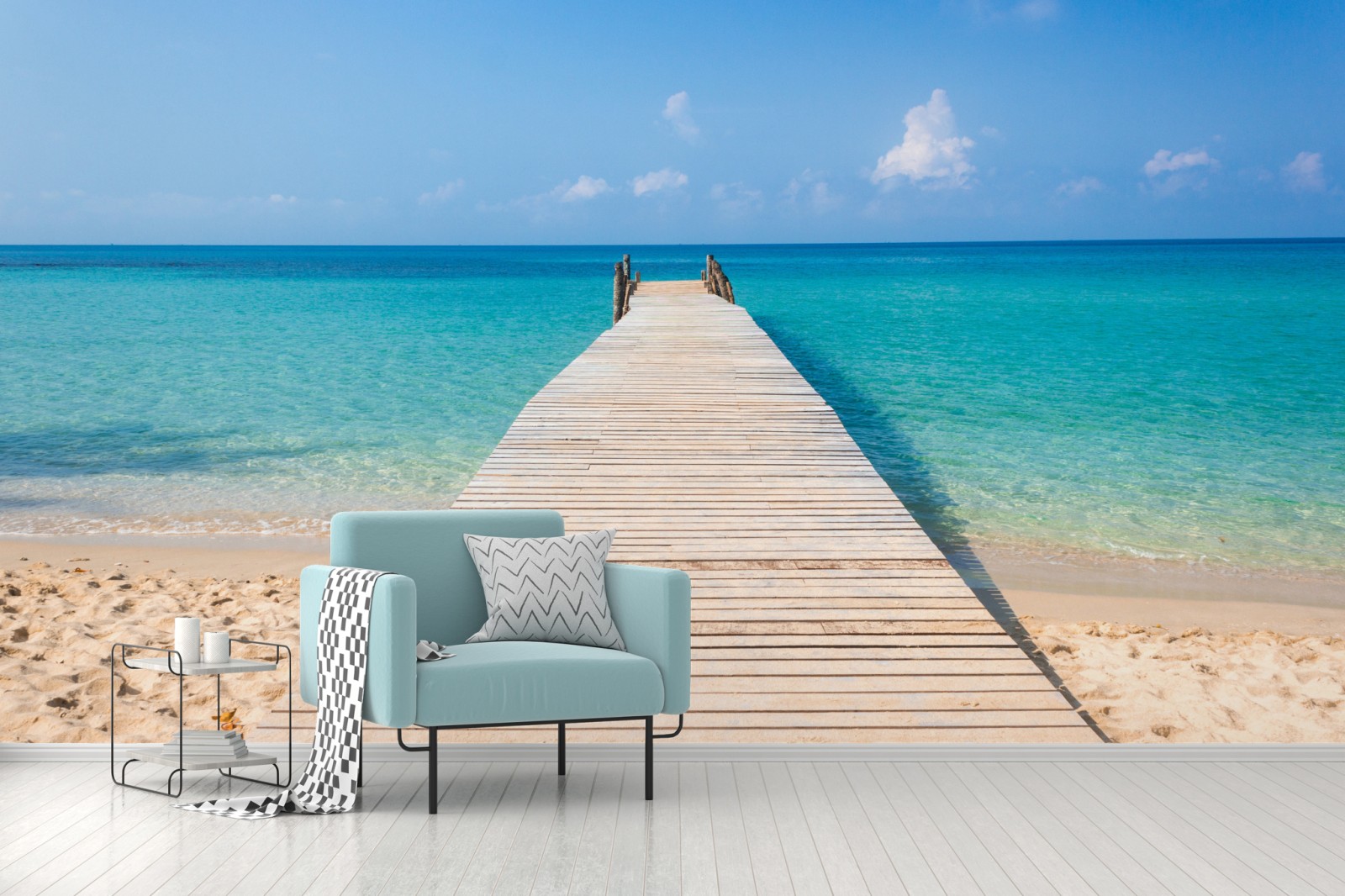 Bringen Sie küstenhafte Ruhe in Ihr Zuhause mit dem Anblick eines hölzernen Stegs, der in türkisfarbenes Wasser führt, perfekt zur Schaffung einer entspannenden Atmosphäre.