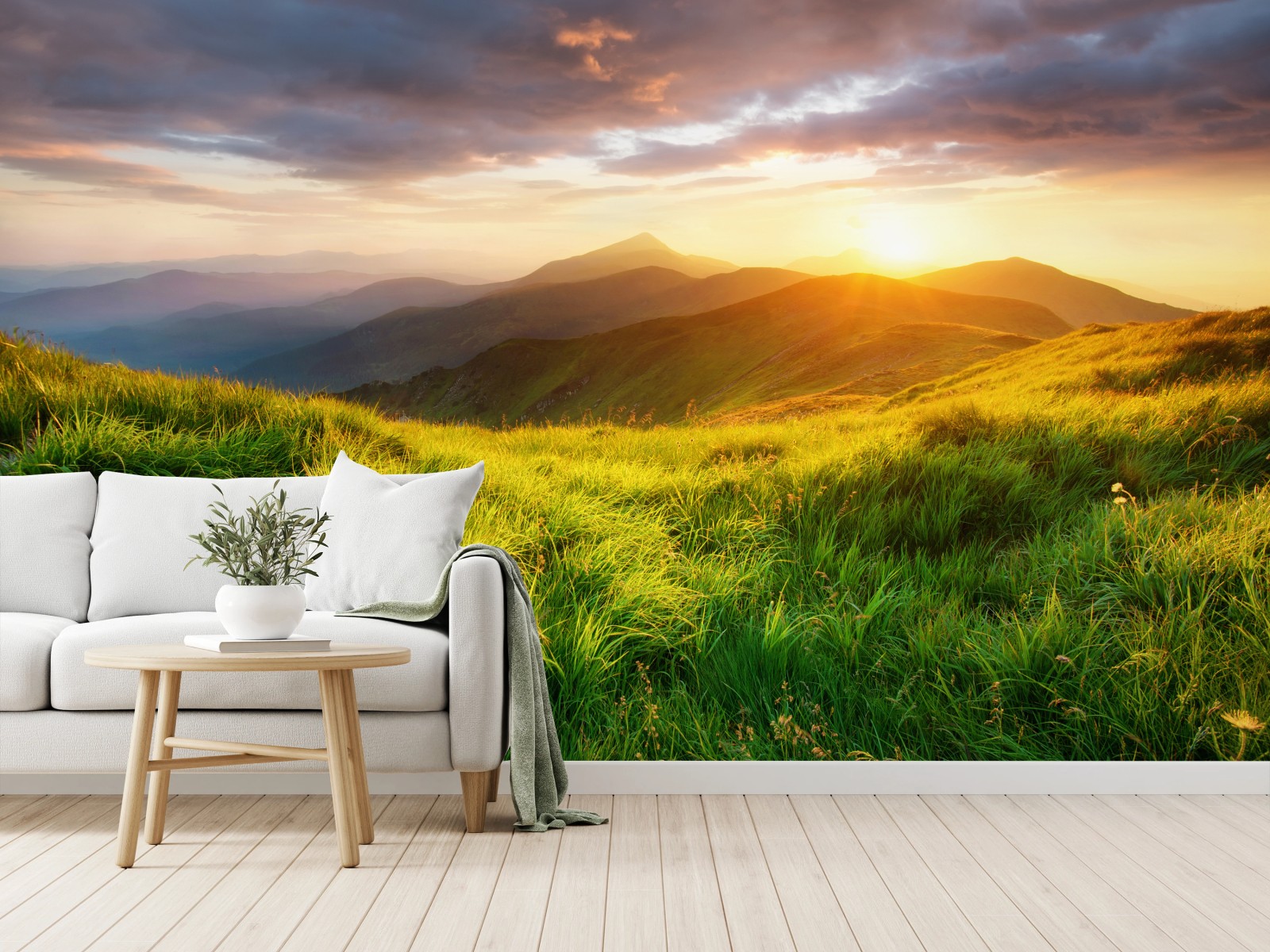 Fototapete Sonnige bergwiese bei sonnenaufgang