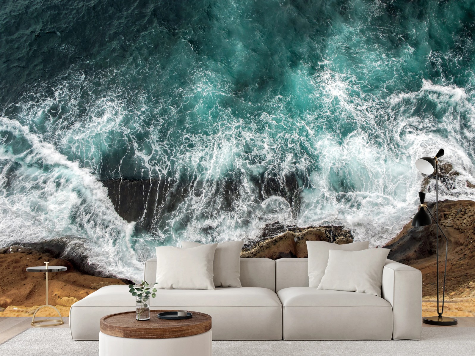 Bringen Sie Meeresenergie in Ihr Zuhause mit einer dramatischen Vogelperspektive auf türkise Wellen, die gegen felsige Klippen schlagen.MehrWeniger