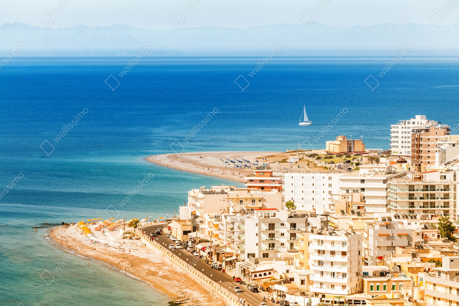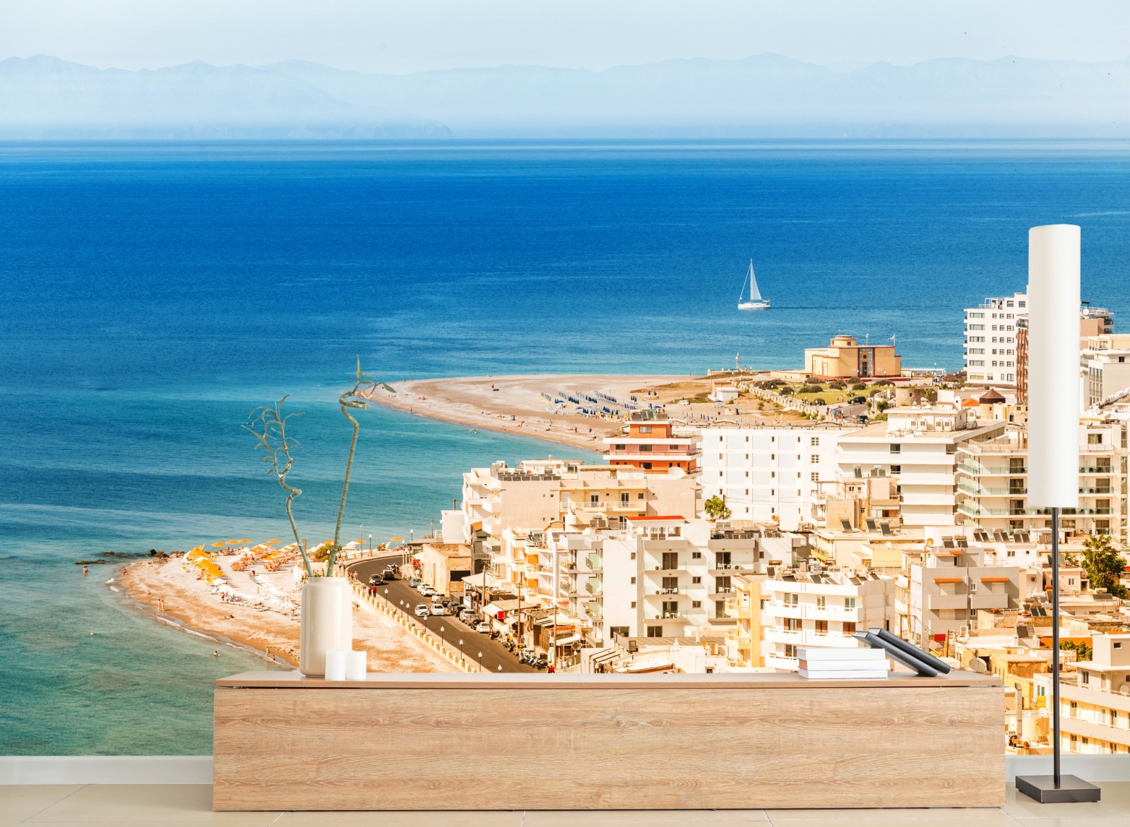beeindruckende küstenstadt-panorama mit türkisblauem meer und sonnenbeschienenen gebäuden, ideal zur verschönerung ihres wohnraums.