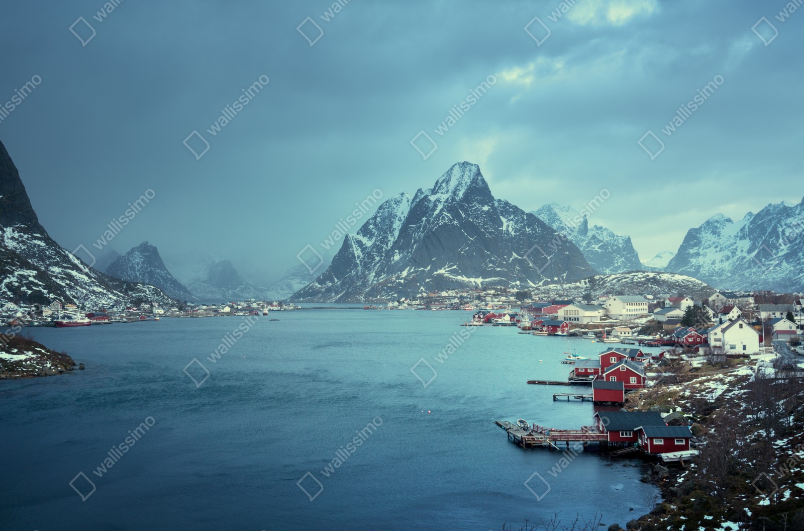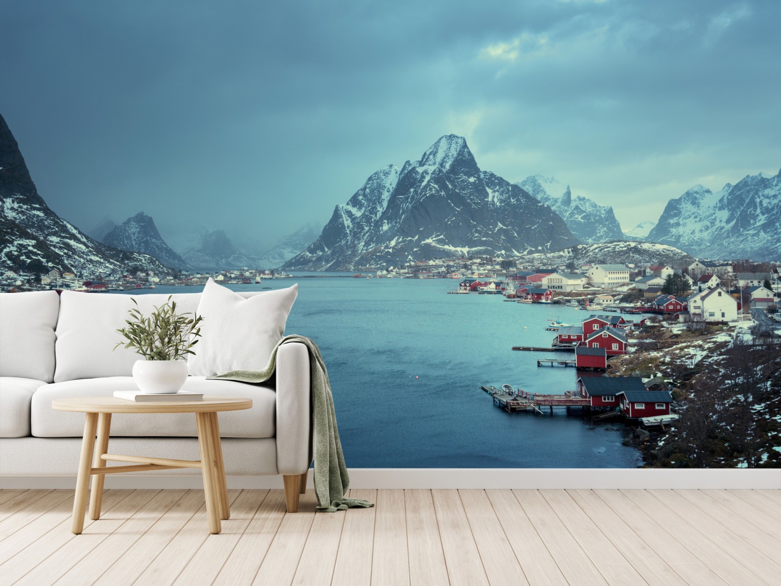 Bringen Sie die ruhige Schönheit von Reine mit schneebedeckten Bergen und roten Fischerhäusern in Ihr Zuhause.