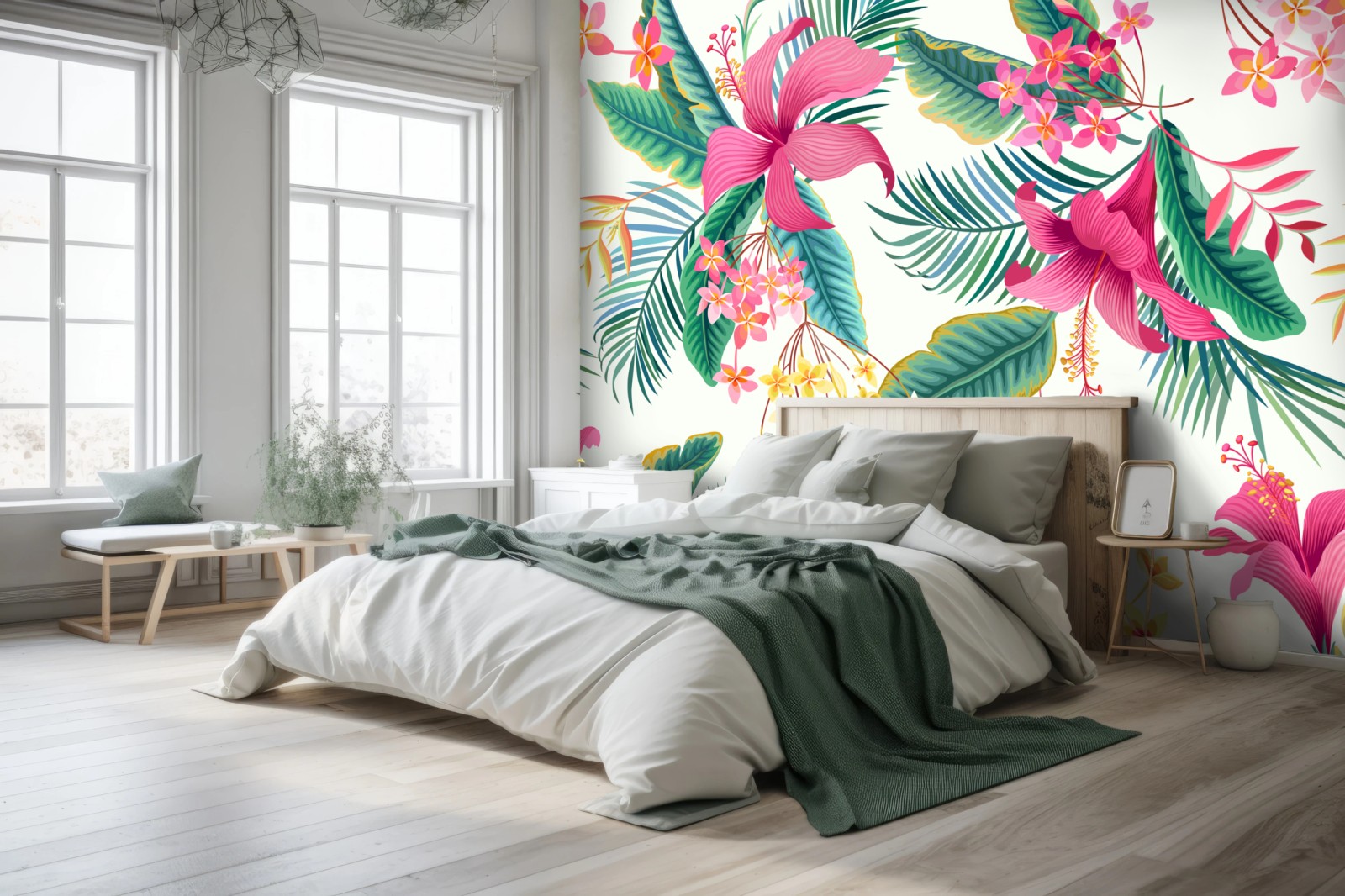 leuchtendes tropisches blumenmuster mit exotischen hibisken und üppigen blättern bringt sommerliche lebendigkeit in jeden raum.MehrWeniger