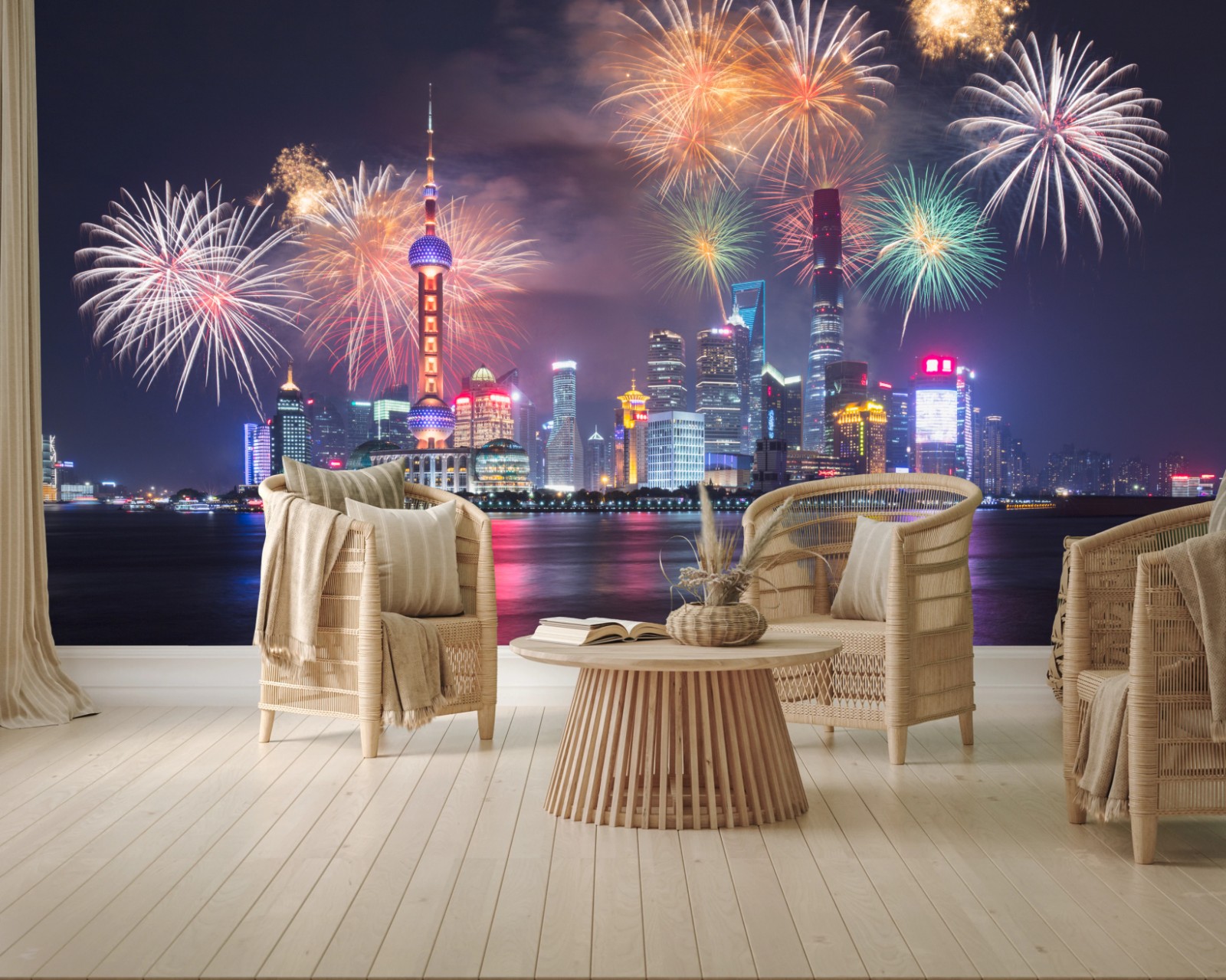 Fototapete Shanghai skyline mit feuerwerk über dem Huangpu