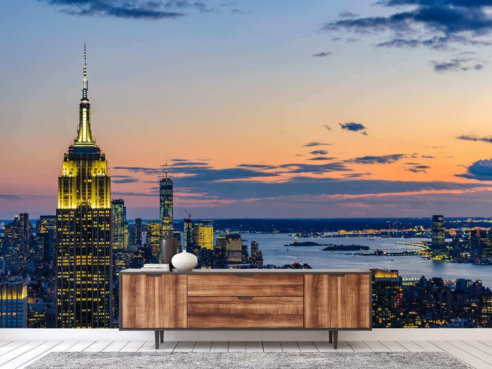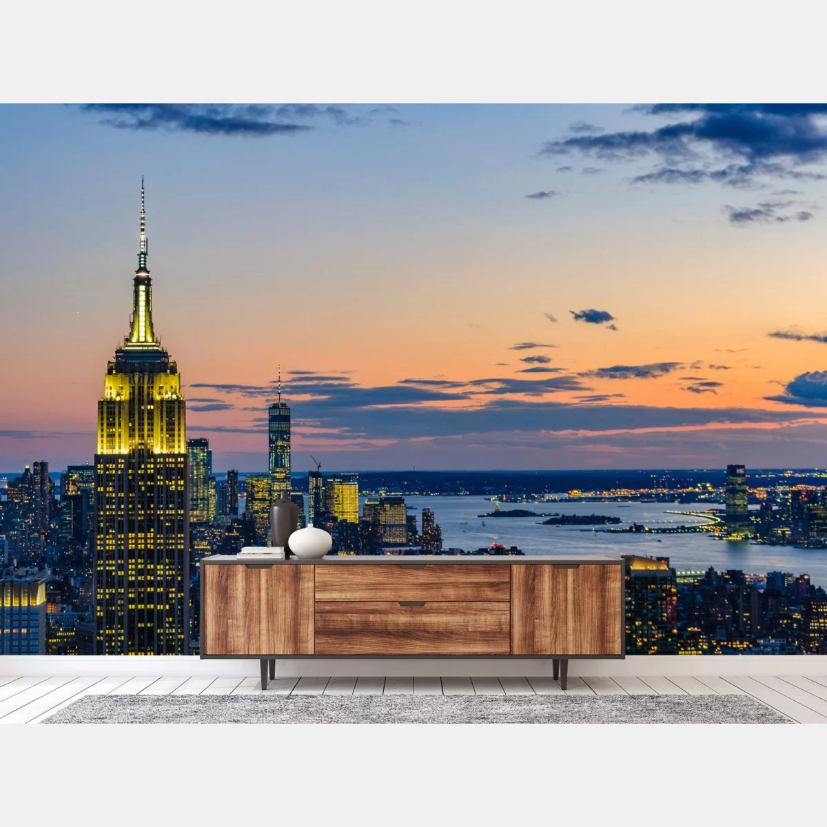 Verleihen Sie Ihrem Raum urbanen Charme mit der ikonischen New York Skyline bei Dämmerung, warmen Lichtern und ruhigem Abendhimmel.MehrWeniger
