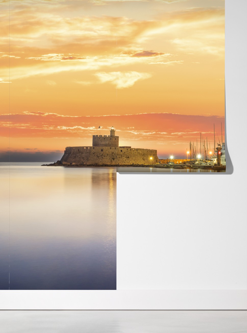Erleben Sie die goldene Ruhe des Mandraki-Hafens mit der Festung Agios Nikolaos und ihren Spiegelungen im ruhigen Wasser bei Sonnenuntergang.