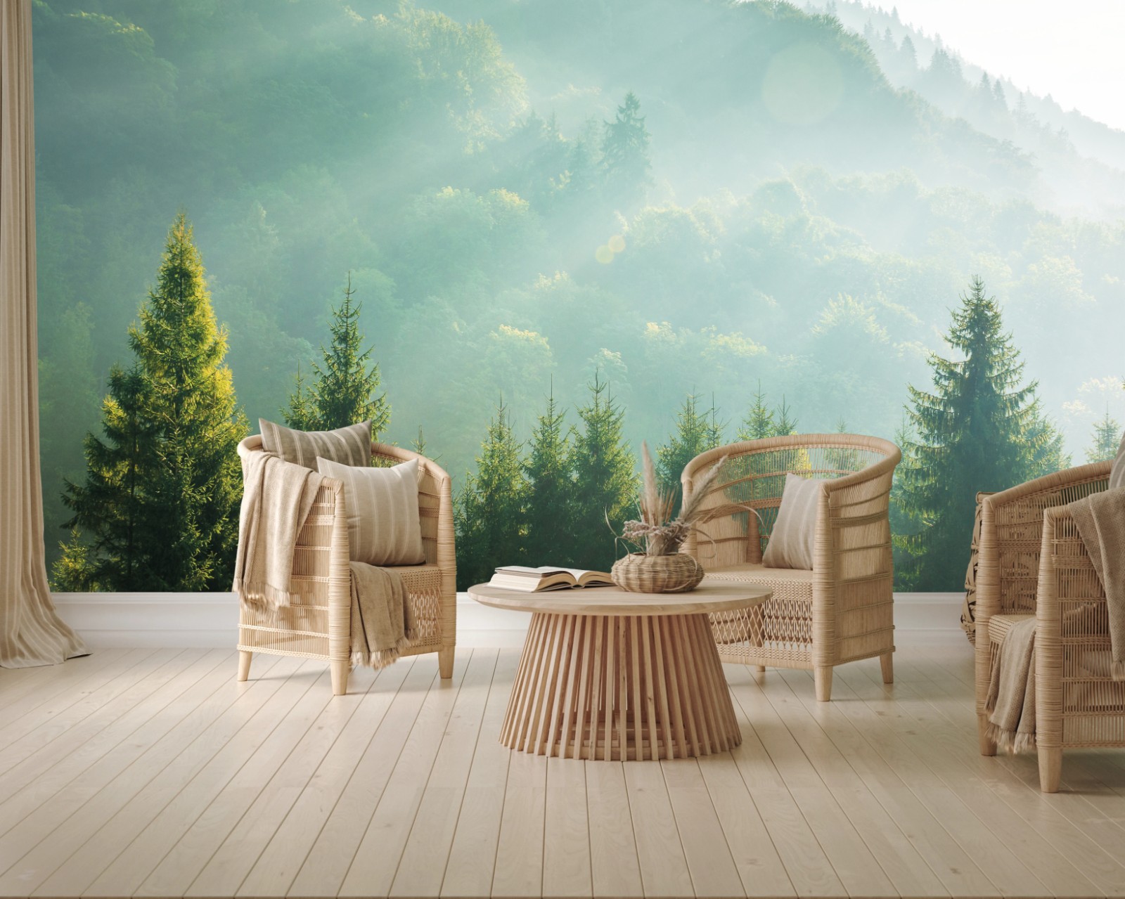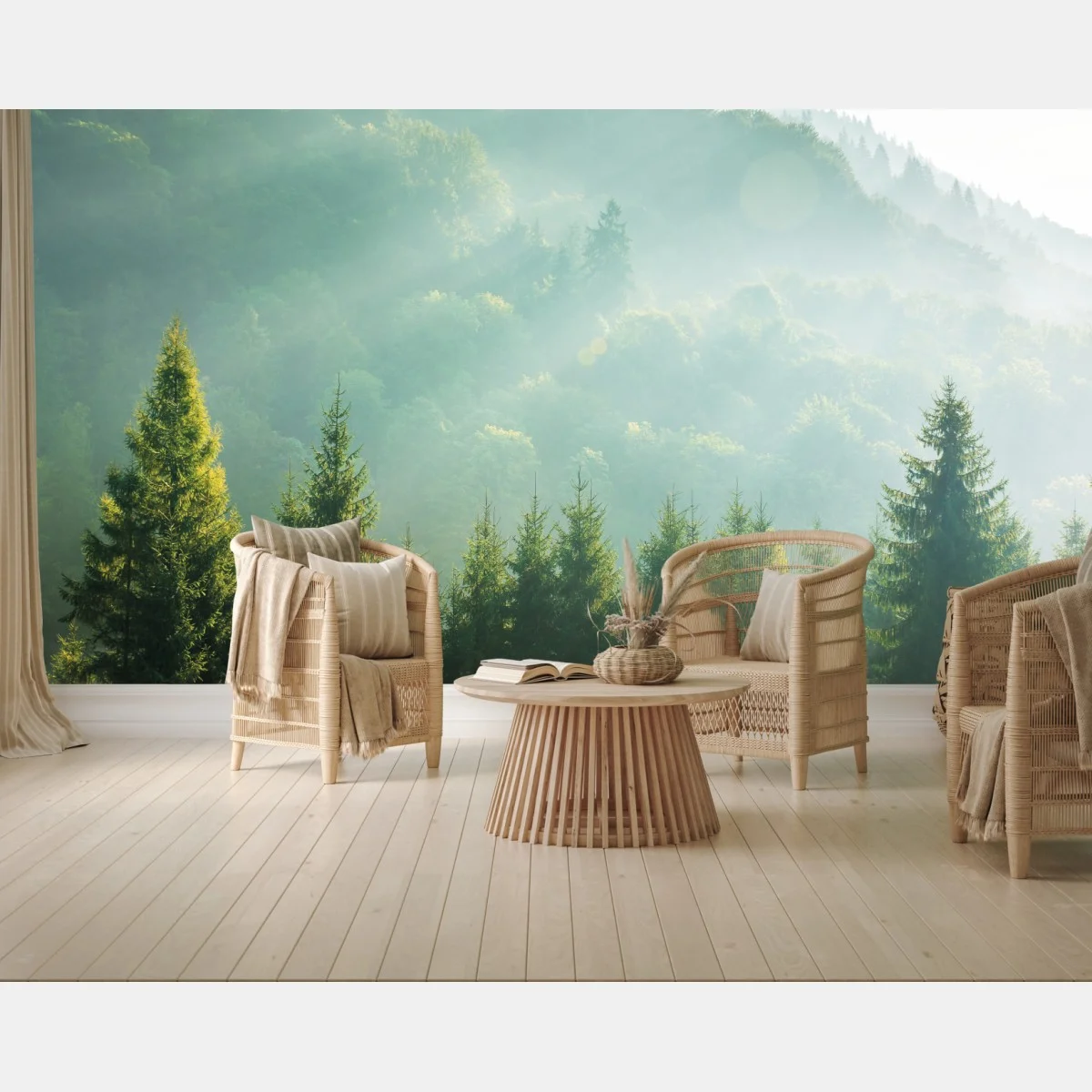 Fototapete Neblige fichtenspitzen im morgenlicht